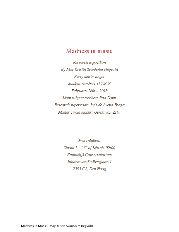 Name: May Kristin Svanholm Hegvold Main Subject: Early Music Singing Research Supervisor: Inês de Avena Braga Title of Research: Madness in music Research Question: How can one, convincingly, portray madness in a musical performance without being considered in a state of madness? Summary of Results: In the 17th century, madness was a relatively common theme in entertainment such as poetry, theatre, and music. There was something that fascinated the people of that time with the uncontrollable nature of madness. Henry Purcell and Thomas d’Urfey was among the many writers and composers who dealt with this subject, and a selection of their mad songs and texts are the main focus of my research. Feelings such as love, hate, envy, sadness and happiness are feelings most of us have felt in our life, but madness is perhaps a state that is exclusive to some people. Is it then possible to portray this state of mind convincingly in a performance of the music? To answer this question, I have examined how madness was portrayed by Purcell and d’Urfey, and generally how people that were considered mad was treated and viewed by the society. After researching the madness of the 17th century and what we today view as madness through music, text, historical documents and other forms of entertainment, I have come to the conclusion that it is possible to portray madness convincingly, but that madness is something completely different than the feelings previously mentioned. One person can view something as madness while someone else sees it as completely normal. Biography: May Kristin Svanholm Hegvold is a soprano from Norway. She did her bachelor's degree at the Conservatoire in Trondheim with professor Elisabeth Meyer-Topsøe, and is now studying for a master's degree in the early music department at the Royal Conservatoire in The Hague, with Rita Dams. May Kristin has participated as a soloist in many productions, including the premieres of two new operas by Norwegian composers, “Pappapermisjon” by Bertil Palmar Johansen and “Kommentarfeltet” by Trygve Brøske. She has also, among other things, been the soloist in Pergolesi’s “Stabat Mater” and sung the roles of Dido, 2nd Woman and 1st Witch from the opera “Dido and Aeneas”. Her latest roles involve Pamina from the opera “Die Zauberflöte” and Piacere from Händels “Il Trionfo del Tempo”.