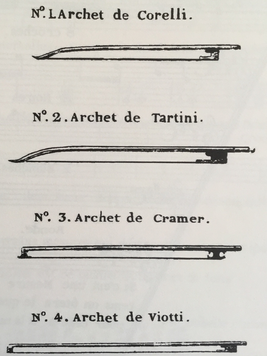 A disagreement between different authors exists when it comes to designate the different types of bows during the baroque period. We have talked about the short and long bow, distinction made according to Seletsky and to the terminology of the time. David D. Boyden, however, makes another classification, which was generally assumed as true and is followed by other authors such as Robin Stowell. He maintains that before 1725 there were two bows in use: (i) the French dance bow, very appropriate for the french style because of its ability to “produce short incisive bow strokes” and emphasizing “the rhythms of dance music”7 and (ii) the bow for the Italian sonata, named by him the Corelli-Tartini bow. This term had been coined by Michel Woldemar8, a French violinist born in 1750, in his Grand Méthode de Violon (1800). Boyden recognizes the inaccuracy of this name, that puts together two violinists with very different styles and ways of playing and born 40 years apart, but he uses it anyway to describe the Italian sonata bow in contrast with the French dance bow. He prefers this term instead of baroque bow, even more imprecise9. Seletsky points out some facts that contradict Boyden’s statement. It is true, as we have mentioned above, that the longer bow is more suitable for the cantabile ideal of the Italian style than the short bow, but we know that many Italian violinists preferred a shorter bow when the longer one was already in use. Corelli was known for its powerful tone produced by a short bow and Locatelli, a student of Corelli, who lived until 1764, also preferred this kind of bow for his virtuoso music10. Tartini, for his part, may have used a lot of bows throughout his life, since he lived during a period of constant innovation11, but two extant bows of his, preserved in Trieste, are a long bow and even an early transitional bow12 (although it seems unlikely that this last one, of a “very rough quality” could have been used by a “noted master like Tartini”13). In conclusion, it is very imprecise to put together Corelli and Tartini to describe the same bow. In addition, there are testimonies which claim that some French violinists, as for example Leclair, used to play with a longer bow than many of their Italian contemporaries14. Seletsky finally clarifies that for him the history of the bow is not very related to the national styles, but more connected with different styles of composition: for the polyphonic style of Corelli, a shorter bow is more suitable, while for a more galant style (Tartini or Leclair) a longer version of the short bow is a better tool15.