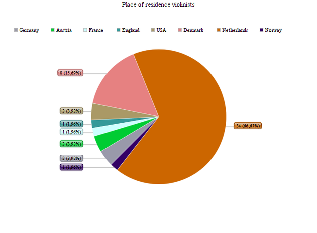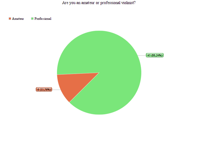 The questionnaire was spread on Facebook and by email during the summer of 2017. 51 violinists filled out the questionnaire (scroll down to see all results of the questionnaire in PDF). The average age of the violinists who filled out the questionnaire is 27,6 years. The rest of the outcomes are shown below in the pie diagrams.