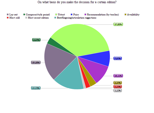 Interesting to see are the reasons that were mentioned prompting the violinists’ decision for a specific edition. Being Urtext is by far the most important consideration (37 %). Second most important ground is the lay-out and third reason is the playing suggestions. Striking is that in general the price has not been mentioned that often as a consideration.