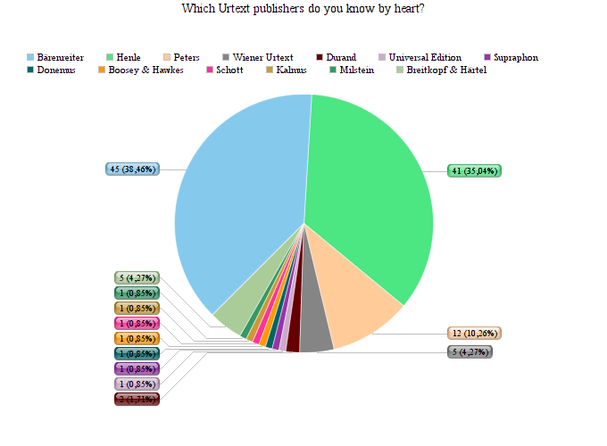 The last question is a continuation of the previous question. The previous question was about naming publishers you know by heart. This question is again “What edition do you like the most?” as was the first question but now referring to the named Urtexts. So this last question concerns only Urtexts where the first question concerned all editions. Notable is that the balance between Bärenreiter and Henle is not completely equal anymore. This question shows that more people have the tendency to prefer a Bärenreiter. Bärenreiter and ‘no preference’ are both chosen 37 % where Henle was chosen only 23 %. Durand and Wiener Urtext were chosen just once and Peters and Breitkopf did not appear in the preference at all.