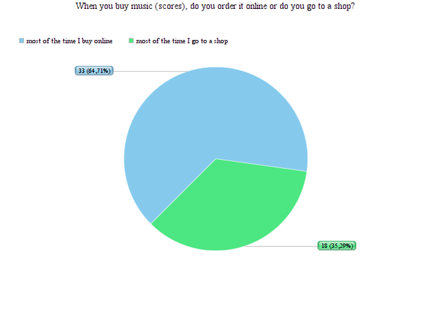 Most violinists who are actually buying a score do this most of the time online (65 %). That means that still 35 % goes to a music store to buy their scores. Linking this outcome to the outcome that lay-out has been regarded as the second most important motive to go for an edition, it is fascinating (and puzzling) how many people just buy the music online. It is much more difficult to compare editions on their lay-out and binding or user-friendliness on the web, where sometimes only the first page is shown as an example, than when you can see and feel the full scores in an actual shop.