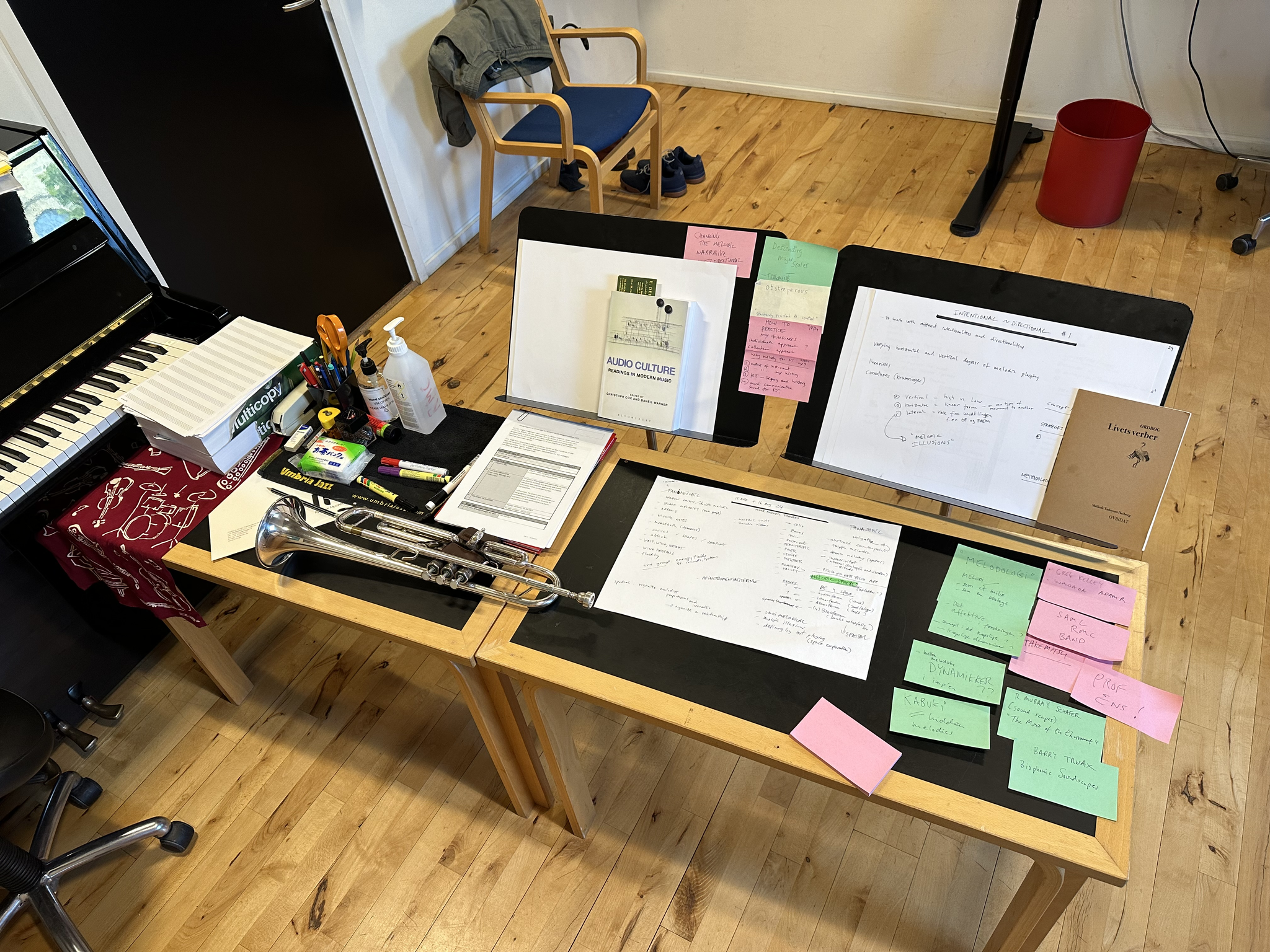 Ever since I was a teenager, I’ve used the walls of my room to build a kind of landscape around myself pinning up notes, ideas, photographs, clippings, reviews, historical artefacts, instruments, posters from travels, tours and concerts, reminders, and much more. It became a way of embedding myself in a world of references, fragments of meaning that shaped how I played, how I listened, how I worked. This environment became my context, a driving force behind my connection to the trumpet, to music, to my ideas.