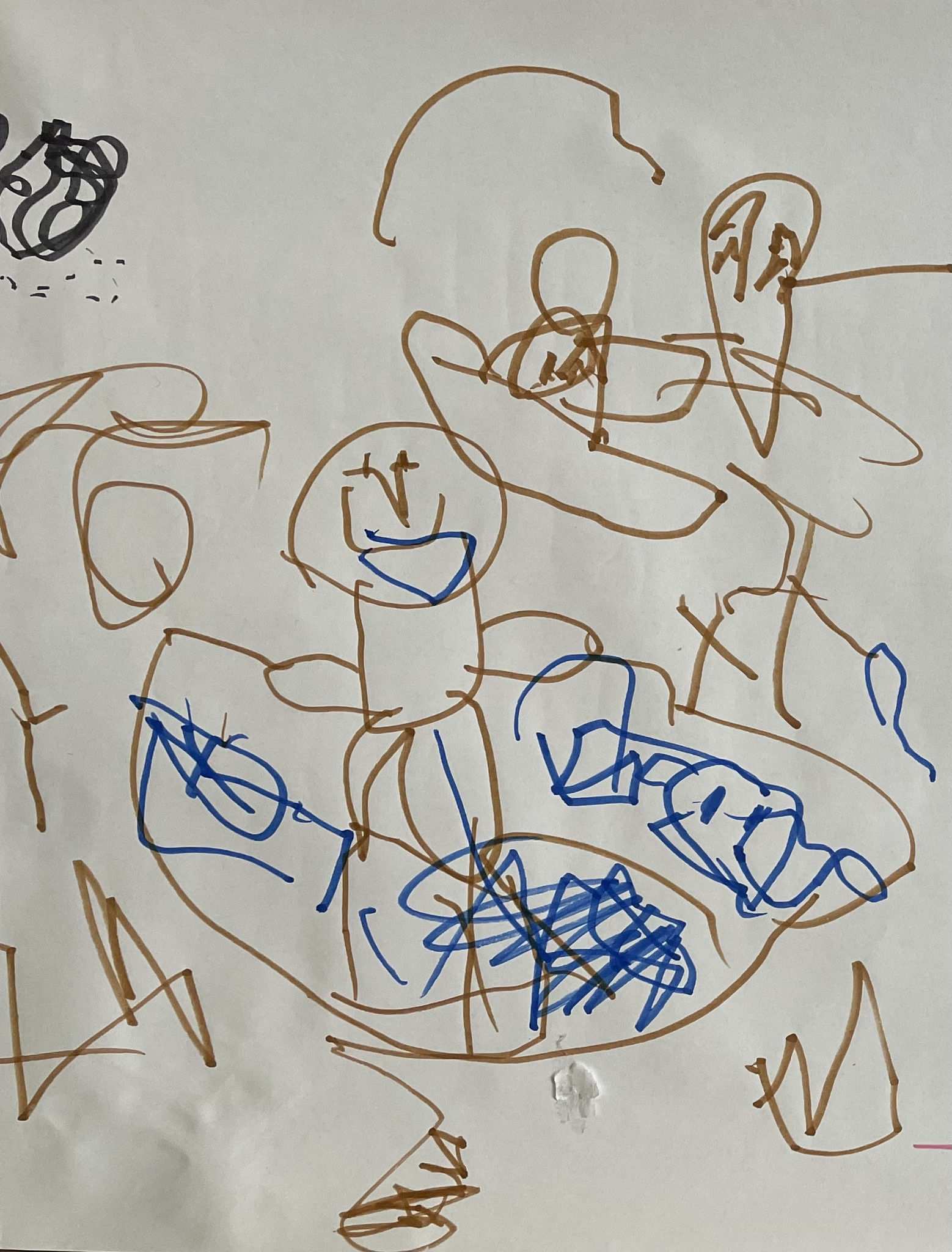 When we talk about the creation, I want to highlight a special moment in the workshop where we collectively discuss the drawings the children have made. This is something that happens in the segment called ‘Discussion about the drawings’. After we had finished playing, we walked around and discussed the drawings with the children one by one and in smaller groups. Along the way, one of the children tells us that he has made a boat that rides on a head. Afterwards, when we sit together with all the children and talk about their drawings, we point out different drawings and ask who made it and what it is, and then we ask what sounds it can make. At one point, we ask about the drawing of a boat driving on a head. First we ask what sound the boat makes, and immediately several children respond with different sounds. Then we ask what a boat travelling on a head sounds like. It takes a second before the children who have also made the drawings respond and make a completely different sound than before.