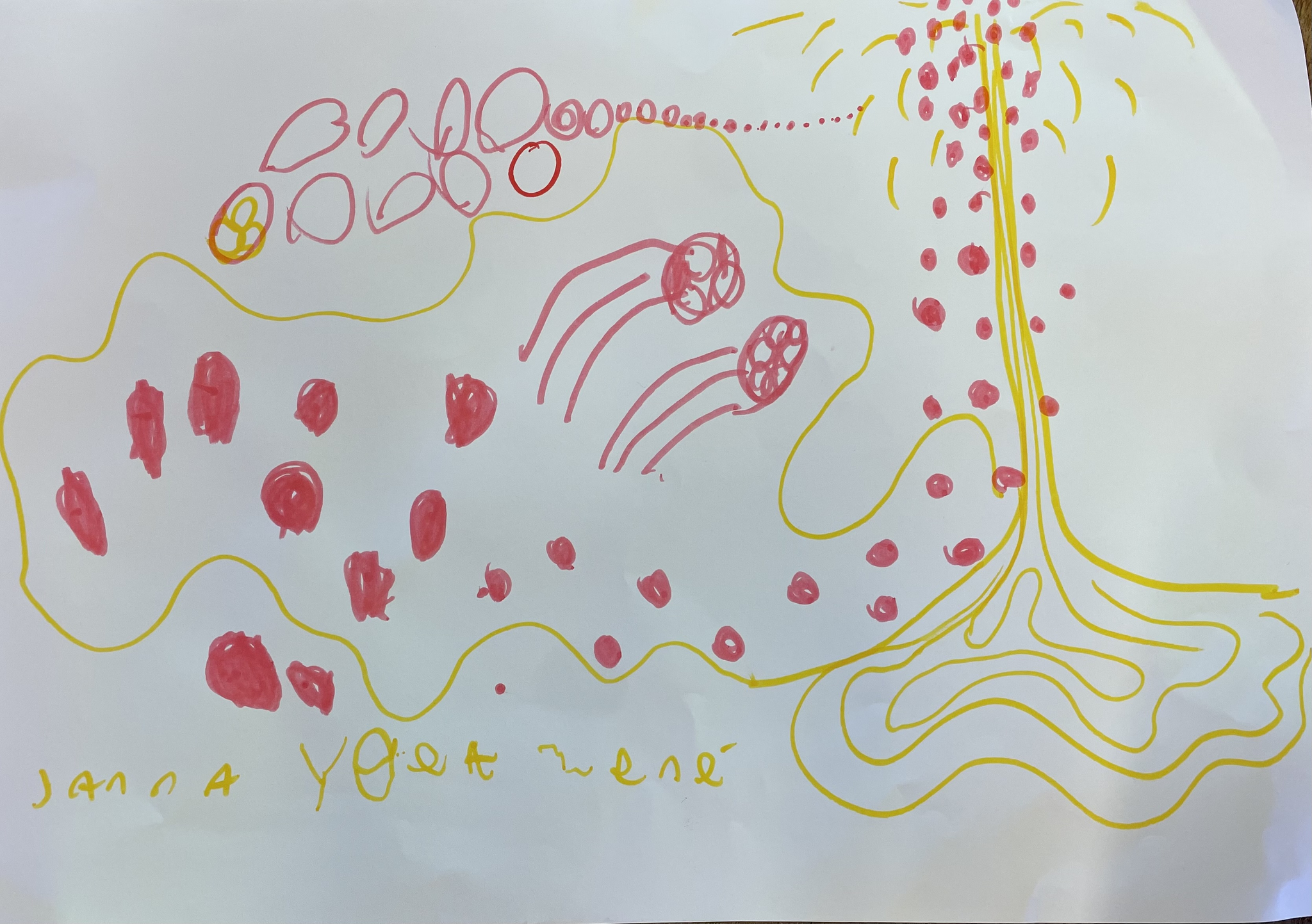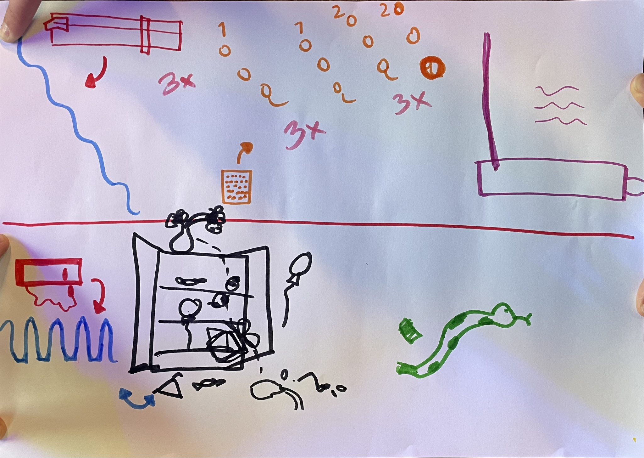 In group one there are three performers, two adults and a child. In their music you can hear a clear musical form and that the instruments have defined roles. The drawing is quite abstract, without any clear lines, but with defined shapes. In the drawing from group two, you can see some clear drawings of the instruments they play, such as the theremin, as well as objects such as a snake and a cupboard. The music they created has a clear tripartite shape with different instruments in the different parts.