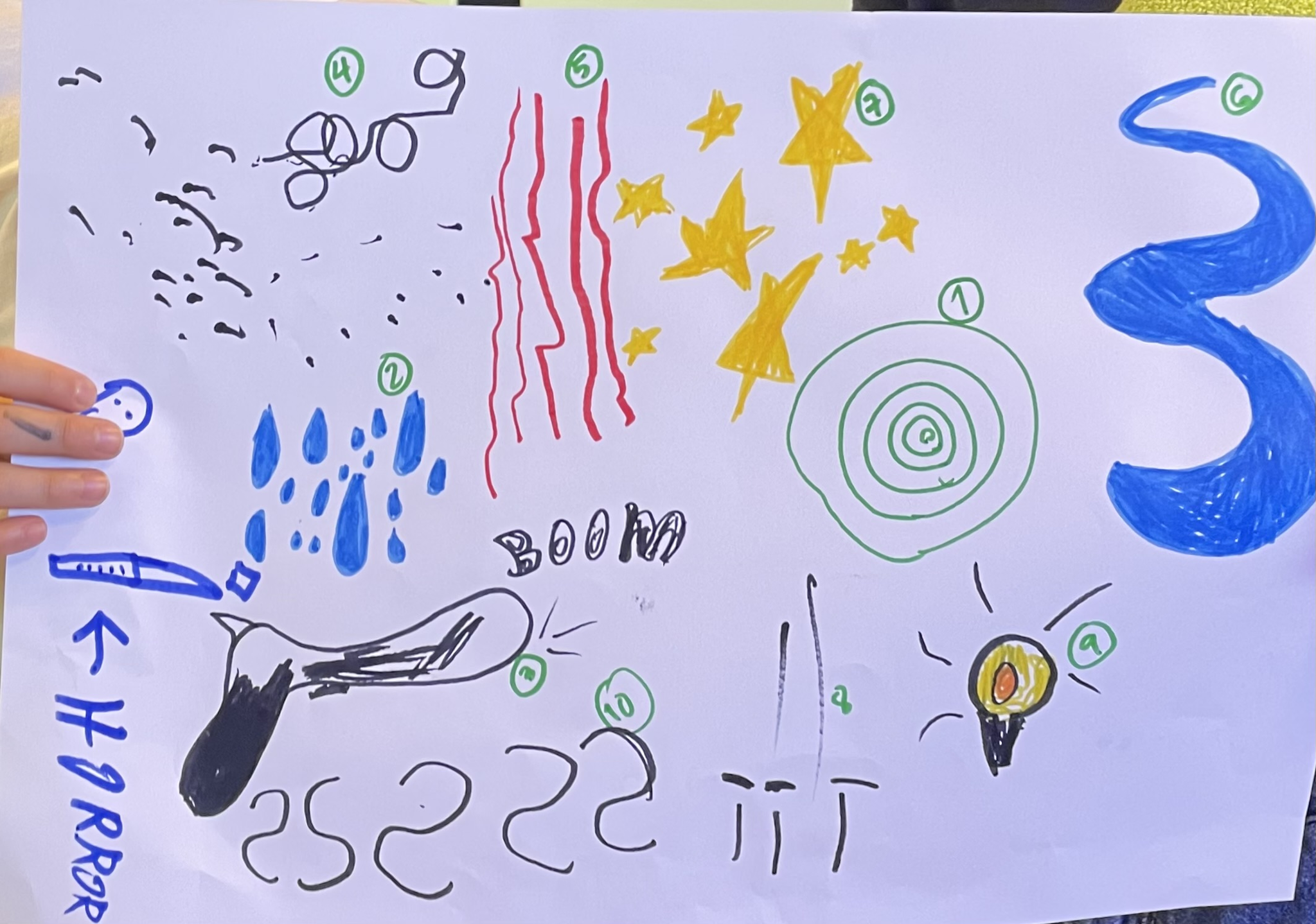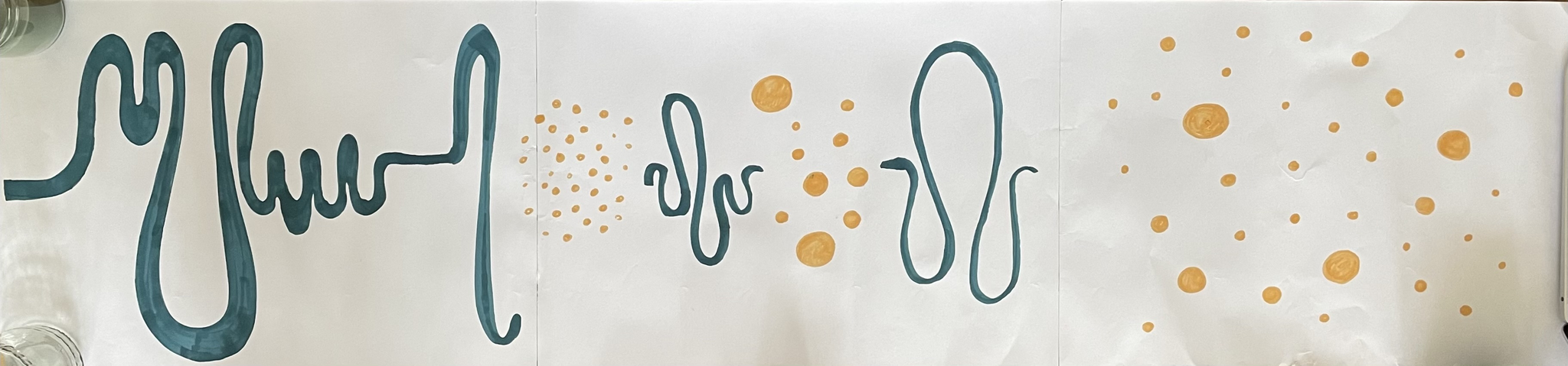 In the example from group 3, the drawing consists of many different elements. All the drawings represent one instrument or the sound it produces. At Roel's suggestion, they wrote numbers to specify the order of performance. In their performance, you can hear that the first instrument creates the base and that the piece continues with elements of different instruments and sounds. In the fourth group, the drawing is characterised by minimalism, with few elements and simple figures. The music, on the other hand, is based on rhythmic elements, with only one instrument playing at a time.