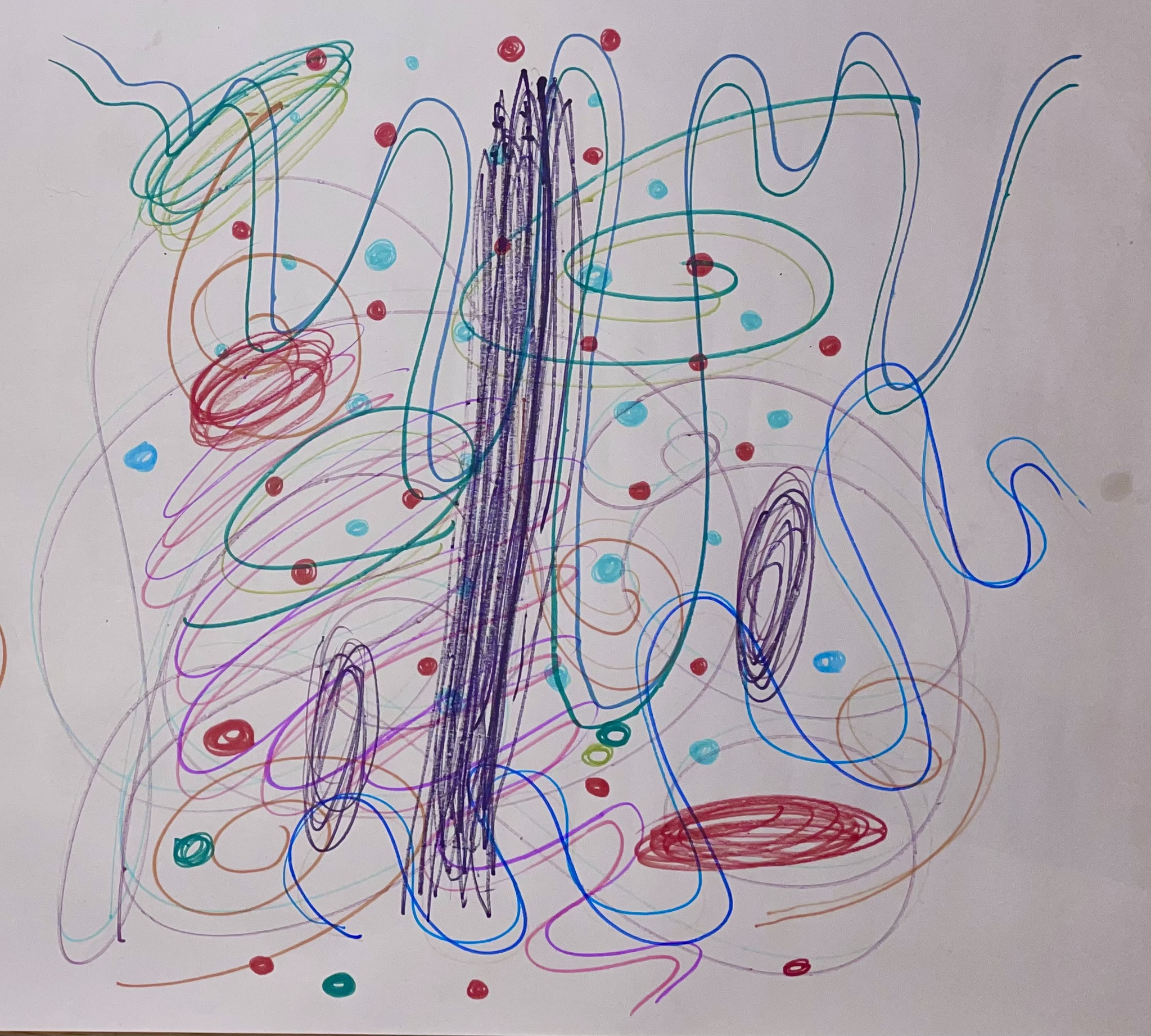 When we talk about being able to play in children's associations, it's about how we as musicians express ourselves and respond to them. An example of this is the way we express ourselves when we are told that green dots could sound blue. Instead of saying that there's no blue in this drawing, we asked “Okay, what does blue sound like?”. After letting another child talk about the color pink, I continue to ask: “Can we see any blue or pink in this drawing?”. In many ways, this question can be damaging to the children's associations because I am again trying to link it to associations we adults can understand. Instead a question like "how does pink and blue sound in relation to this drawing?" would maybe be more fitting because instead of concluding the obvious for us adults, it opens up for us adults to dive into the children's world. In other words the verbal tools we need are tools that make us able to dive deeper into the child's world of association.
