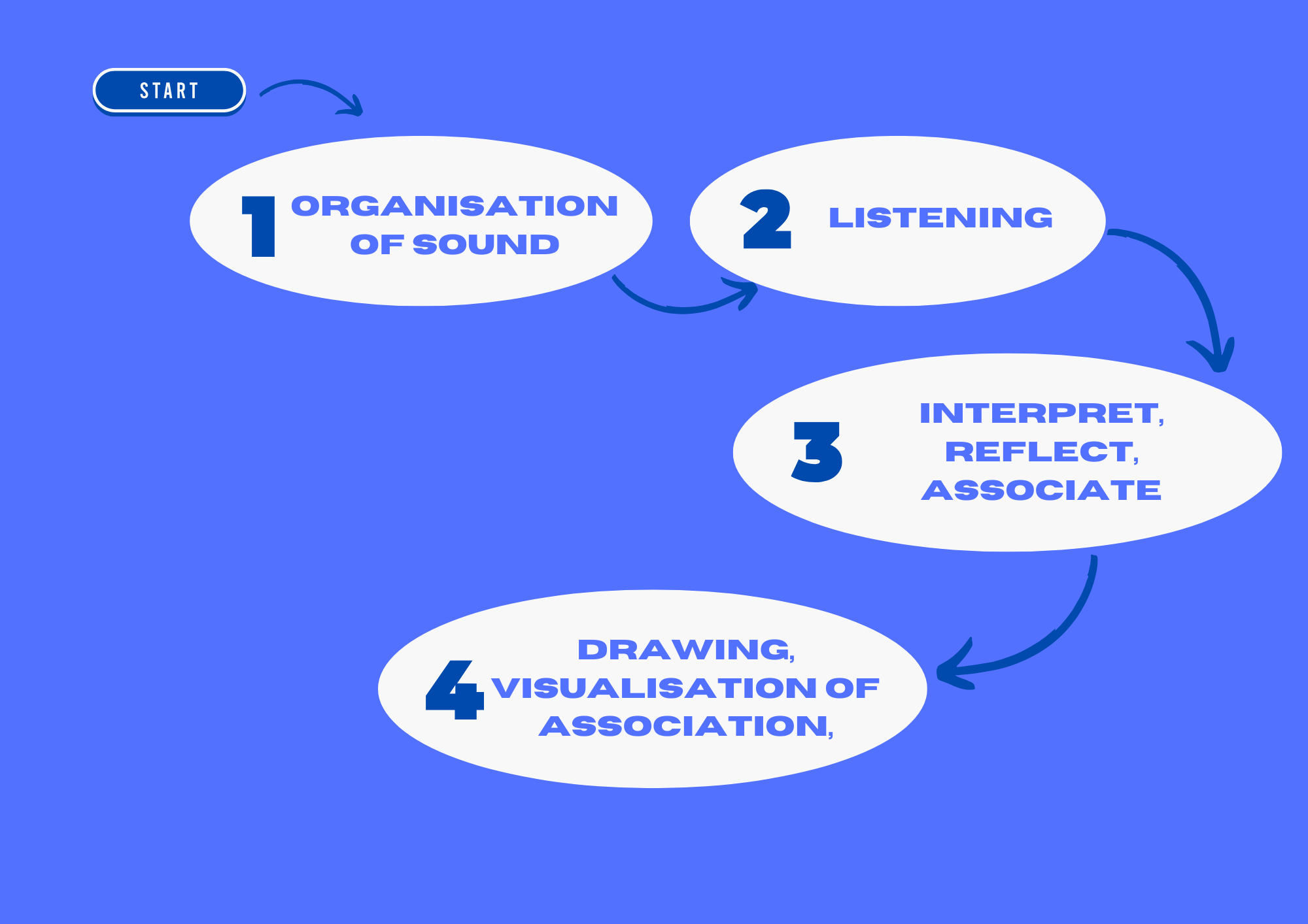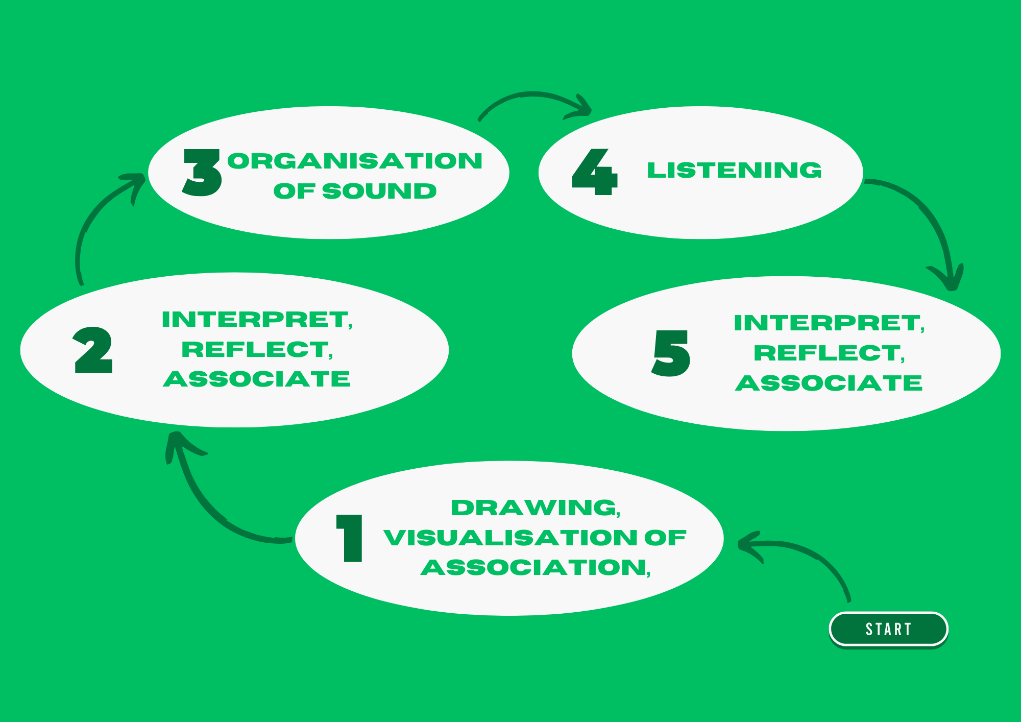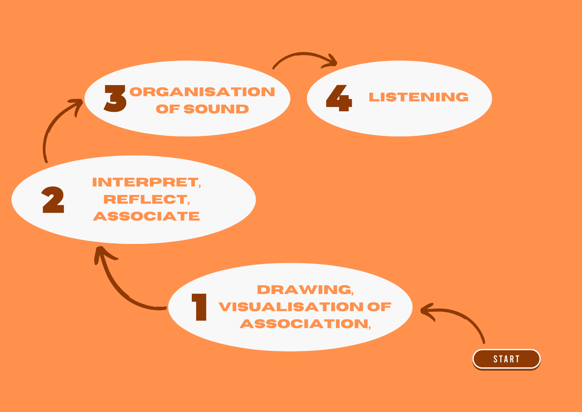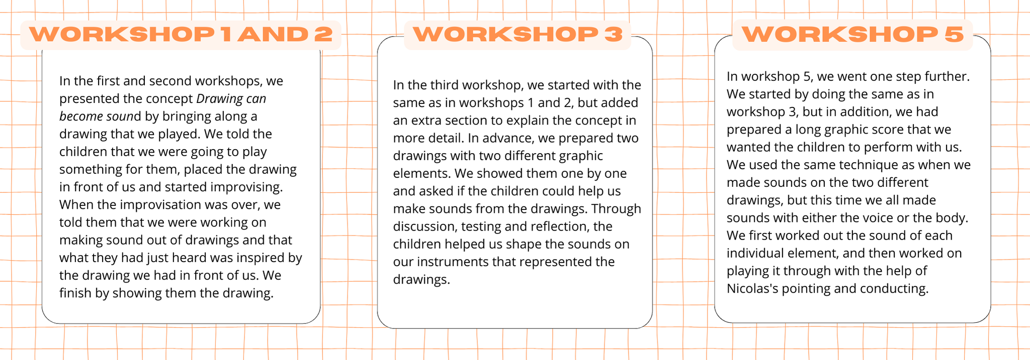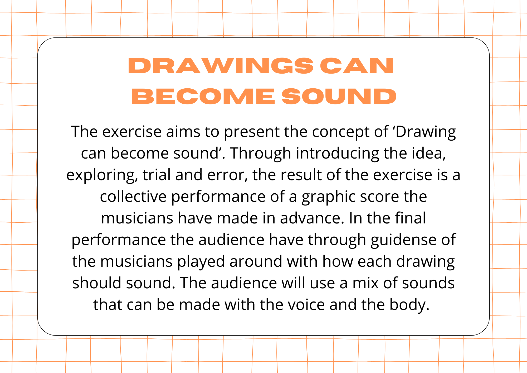 This workshop started with an idea to make experimental music more accessible through the use of drawing and graphic notation. During these six workshops, my fellow musicians and I have, through exploration, developed a workshop consisting of several exercises related to the concept that drawings can become sound and sound can become drawings. Through these workshops, we have naturally landed on a form that consists of five parts/exercises: Introduction, exploration of how drawings can become sound, creating our own scores, performing the final score, summarising. Parts 2-4 can be seen as ideas that have developed into exercises through exploration and reflection during the first 5 workshops.