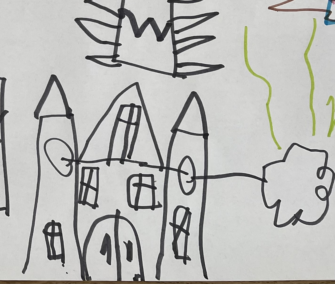 In connection with all this, a peculiar thing happened in workshop 2 that may indicate that the children are more aware of the music than we think. During the rehearsal, the music suddenly became fast, noisy and loud. The children suddenly start laughing, and one child shouts: "It sounds like a farting castle!". When looking through the drawings from that workshop one can see a castle that for many seems like it is farting.