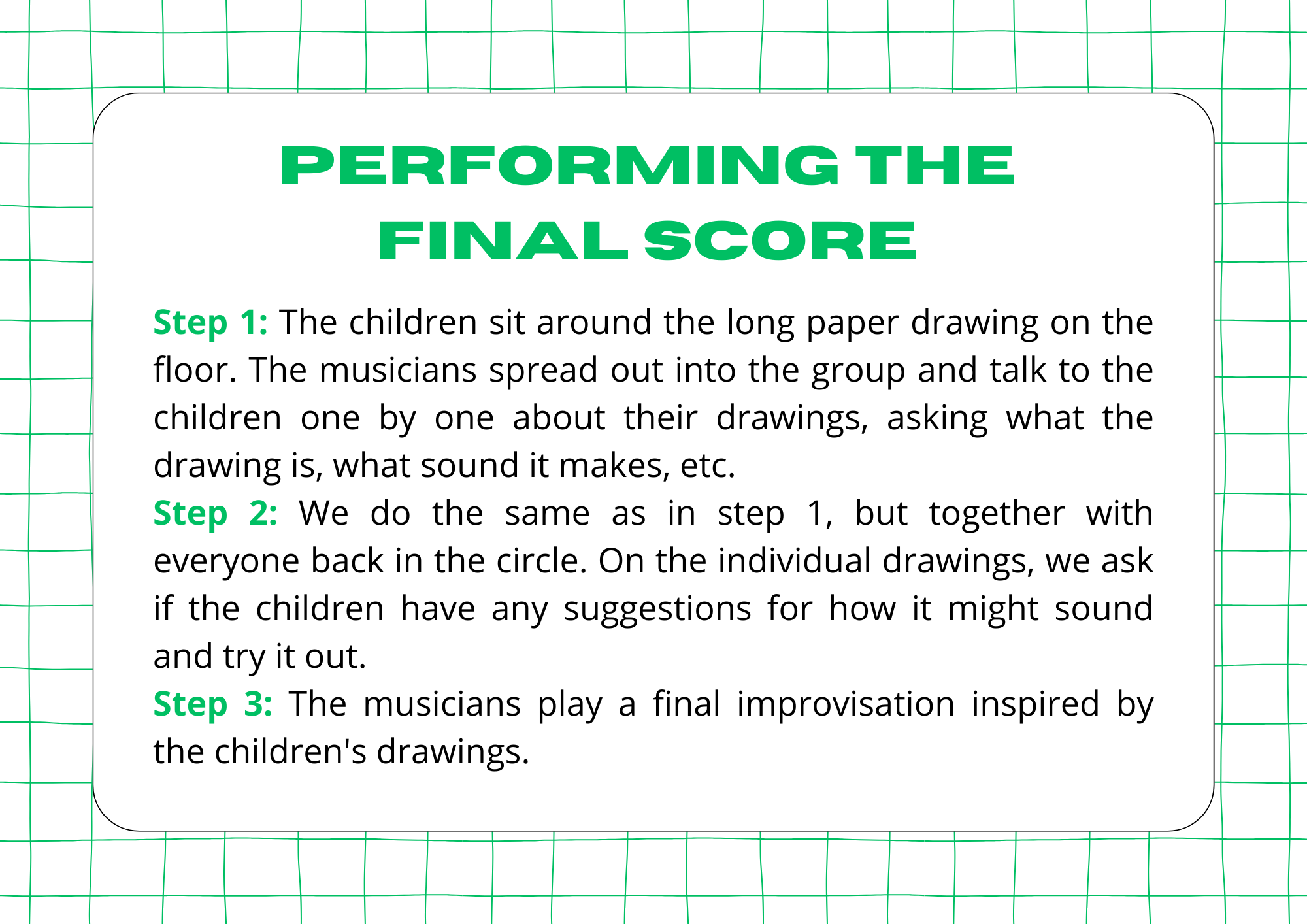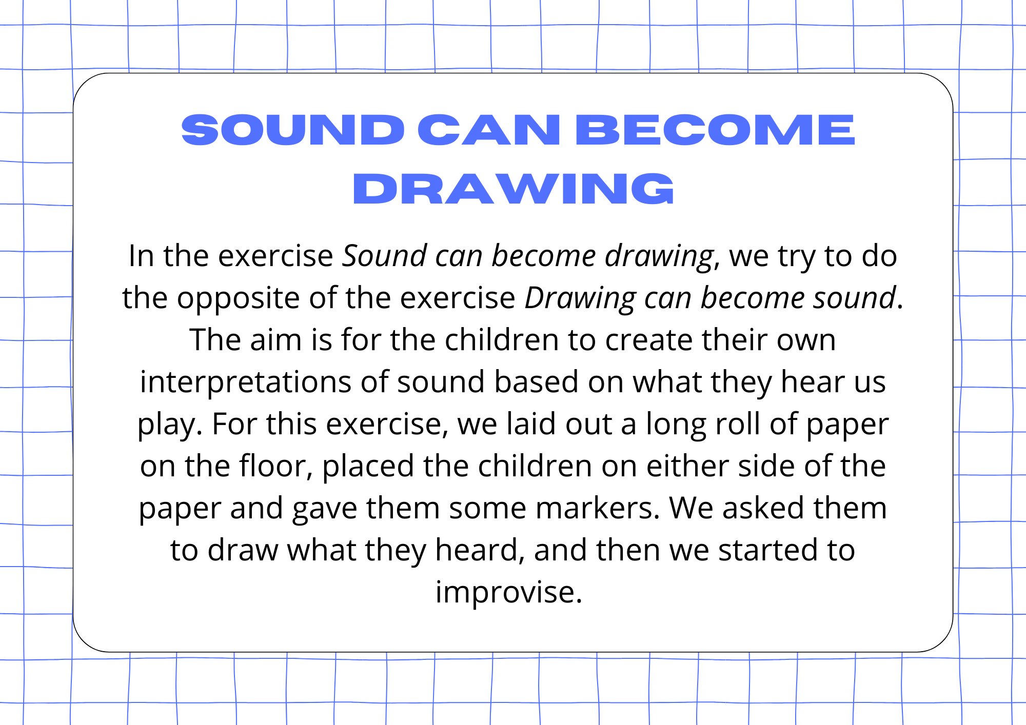 After the first six workshops, the current layout of the workshop presents three or four moments where the organisation of sound takes place. The first is when we, the musicians, play the drawing we have brought with us. The second only happened in workshops 5 and 6, when the musicians, together with the audience, performed the large graphic score we had prepared in advance. The third sound moment is when the musicians improvise while the children draw. The final sound moment is when the performers improvise over the children's drawing.