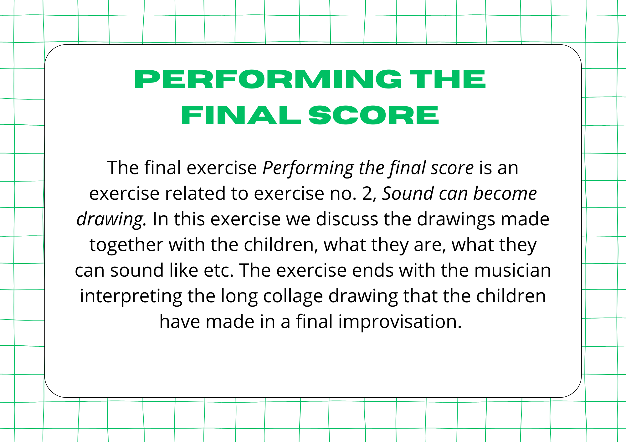 In the last two workshops, I want to focus more on making this exercise clearer, both for the audience and for us musicians. My fellow musicians and I need to talk more clearly about how we proceed the drawing and how we perform it. Should we change the way we create the score by using small pieces of paper? Should we move around during the final performance? How do we interpret the children's drawings and how do we explain how we approach our interpretation? This exercise has so far been created through spontaneity and exploration, but after going through the videos I think we musicians need to talk about how we approach the drawing and the questions we ask the children before we play, in order to make it clearer to the audience what is going to happen.