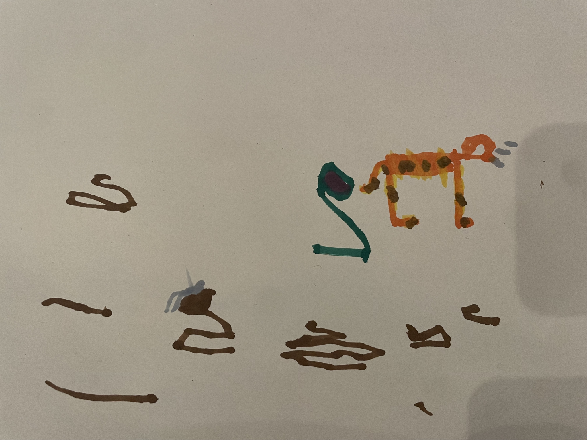The third drawing is of three things, a cat, a catapult and a flower. The child went on to explain that the cat was dirty and it was also very important to point out that the cat had whiskers, which you can clearly see in the drawing (Workshop #8, 31.25").