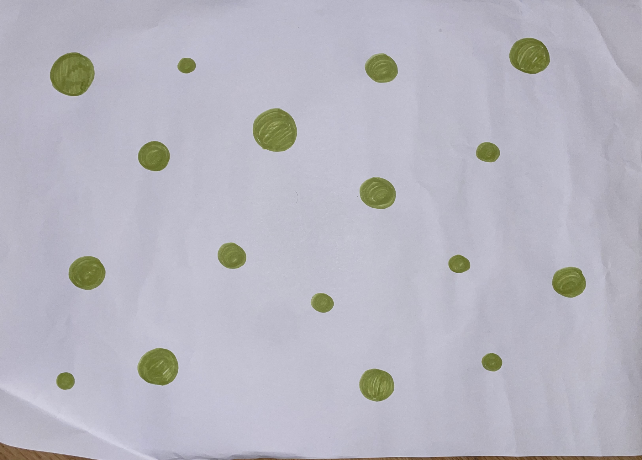 In this workshop, there are three interesting moments to take a closer look at. The first is something that happens during the first exercise, Drawing can become sound. We show them a drawing with a lot of green dots and ask what sound this can make. Immediately after asking the question, one of the children answers “blue”. I follow up by asking what the color blue sounds like. Another child answers dark, while a third child continues by saying that "the color pink is thin". I continue to ask about the drawing if it has any pink or blue in it, and one child continue saying "no green", and another child continue saying "green is grass". Jenny continue the conversation with asking how the grass sound like. Here it is relevant to know that grass in Norwegian is gress, because the child answers Jenny's question by making the sound "grrrrrr".