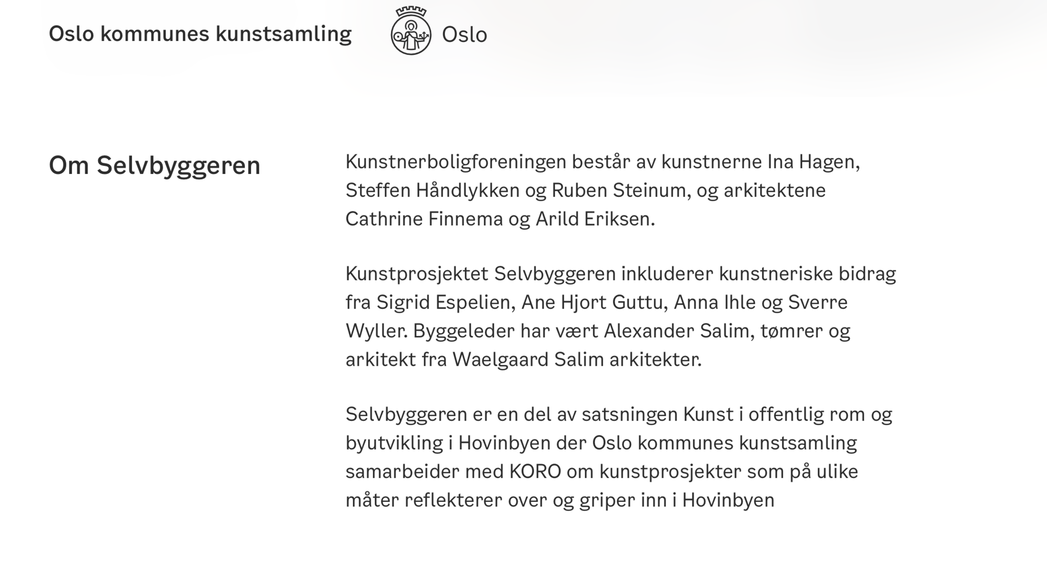 Skjermdump fra Oslo kommunes kunstsamling https://www.kunstsamlingen.no/aktuelt/aapningsfest-selvbyggeren-paa-oekern (sett 04.03.2024)