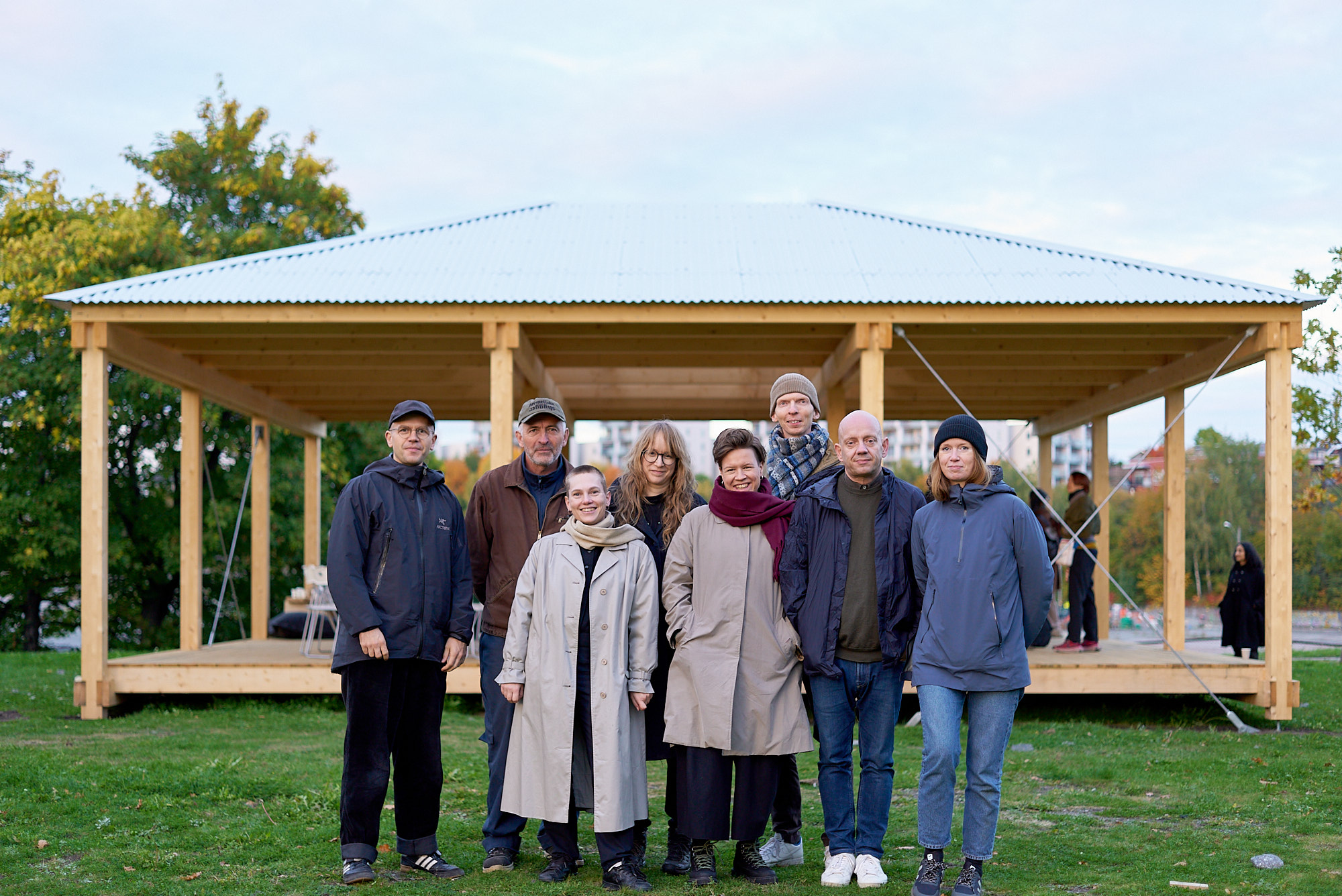 29.09.2022, Fra åpningen av Selvbyggeren på Økern foran paviljongen. På bildet fra venstre er Ruben Steinum (kunstnerboligforeningen/ UKS), Sverre Wyller (kunstner i prosjektet), Ina Hagen (Kunstnerboligforeningen/ UKS), Anna Ihle (kunstner i projsketet), meg (kunster i prosjektet), Steffen Håndlykken (Kunstnerboligforeningen/ UKS), Arild Eriksen (Kunstnerboligforelingen/Fragment arkitekter), Cathrine Finnema (Kunstnerboligforelingen/Fragment arkitekter)
