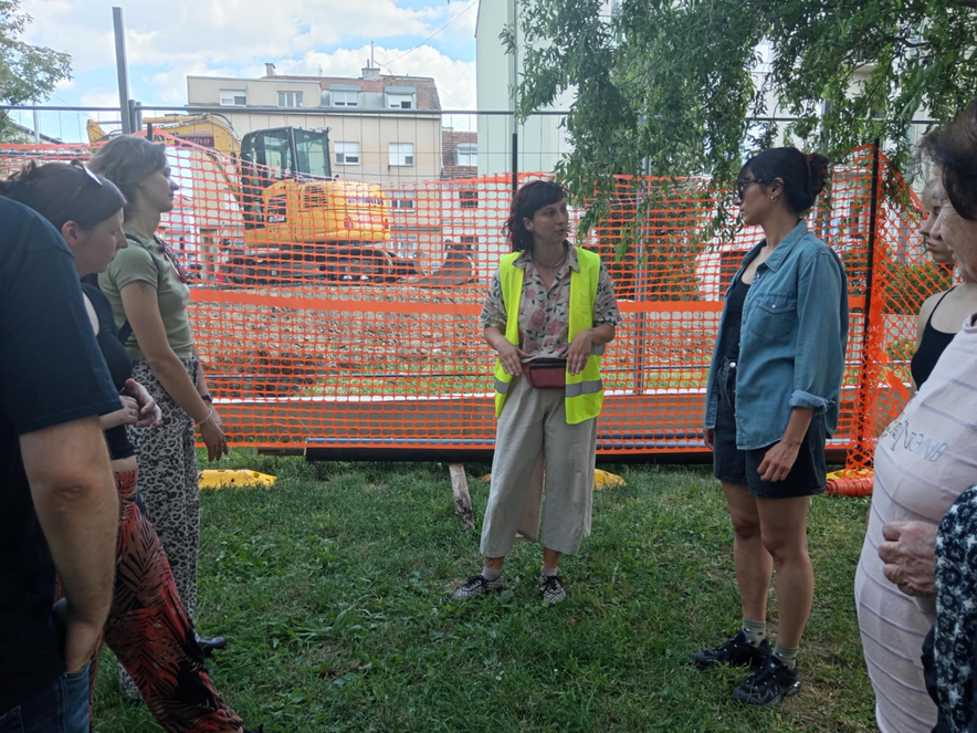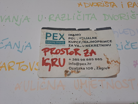 The procedure of building a resistance step by step: from the foundations to the roof. Building resistance through the locality, originality, specialties of the neighborhood, and its community. Building resistance to the domination of the sounds from the construction site with the sound of the chansons dedicated to the neighborhood by Zvonko Špišić, neighborhood poet. As the real construction site spills onto the street, so does the resistance on our construction site spill onto the street with the messages for the investors. Reclaiming and reconstructing the space across the site.