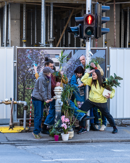 Performers come from all sides of the street and stand still right across the site. while the song "My People's Houses" is played. Throughout the song, performers change their shape while slowly coming closer to the fence of the site and diving into a physical greeting from the location.