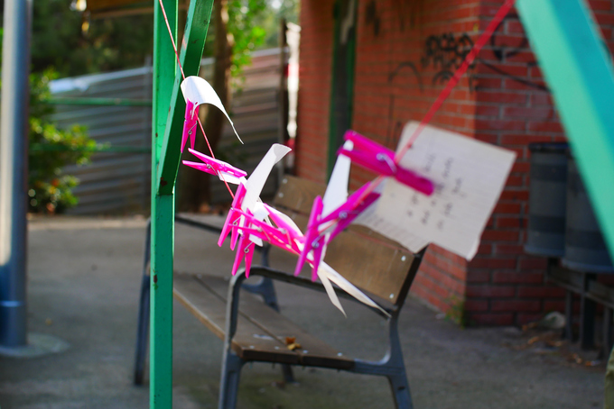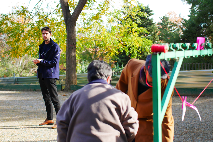 To prepare the field for the experiment, I went to the petanque court with Catarina an hour before the activity began. We tied a red string to a coat rack on the side of the petanque court, where participants would attach their physical observations of the space. There were seven participants in the activity: three elderly women from the gymnastics group and four younger international students. Francesco, who was responsible for documenting the project, was also present.