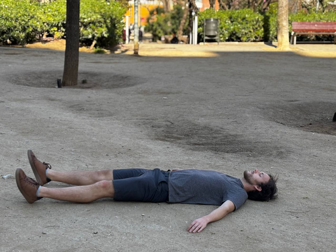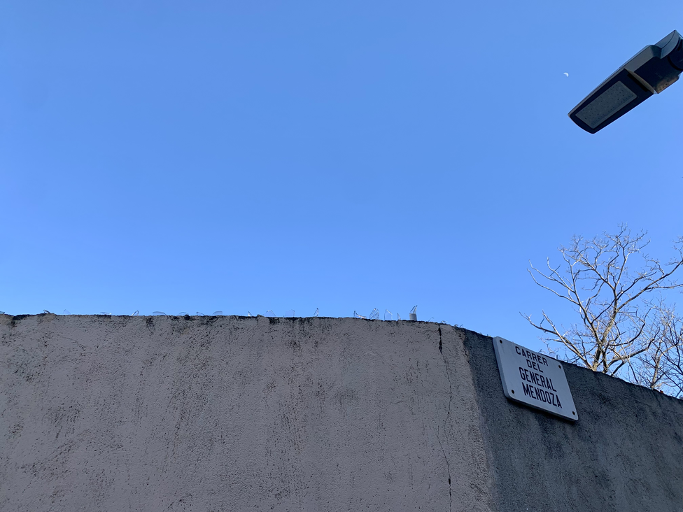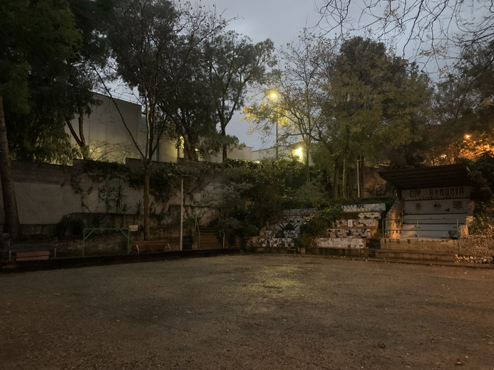 From the centre of the petanca field, turning slowly as if I were a topography instrument doing a 3D scan, I see a lamppost that doesn't work, a tree, a bench, a no-entry road sign, a building with lights on the second floor, a tree closer, more trees further away, another bench, a fence, a distant van, a white truck, a white car, and between the two a black car, another lamppost that doesn't work, another tree, a hill full of trees, a sign saying not to bring dogs, more bushes, trees, a grandstand, a grandstand with five steps each and in the middle of the two grandstands a canopy with the words CP Armonia, founded in 1967, and three coats of arms, all done in mosaic. I see another metal fence above the grandstands and between the grandstands more plants, a staircase going up to the upper floor, another bench, another lamppost that doesn't work, the bare tree I saw earlier, a green coat hanger where we hung our remarks the other day, a red brick table, a bench, some baskets, some trees, another lamppost that doesn't work, what are probably toilets with other lights that don't work, more trees, a tree, the metal fence a bit hit by who knows what, and more trees, three trees.