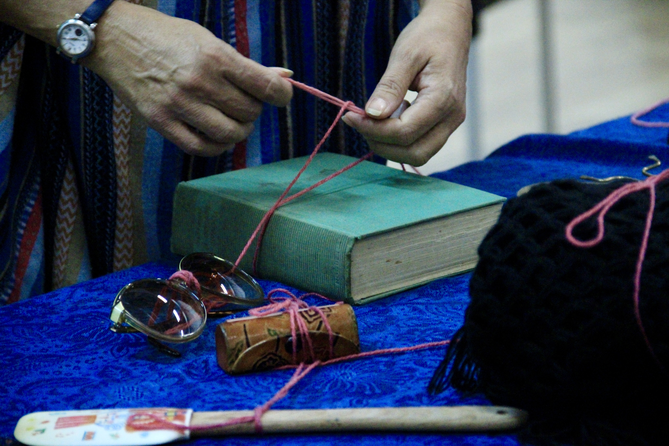 As a group, tie or weave the threads into a shared pattern (e.g., around the altar, connecting objects, or forming a symbolic web).