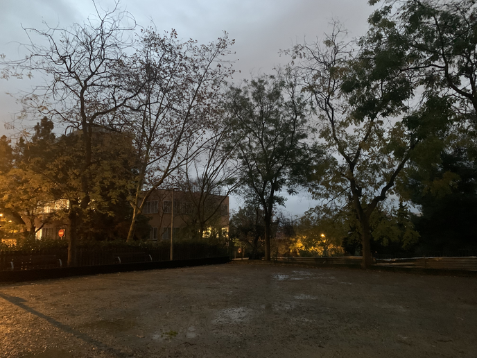 Recording from the petanca field, bottom right corner. I immediately notice the sign that says respect the plants and on this side you notice much more this wall on which ivy grows and buildings behind where there are lights that look like lights in a hospital. and street lamps that have whiter and warmer lights.