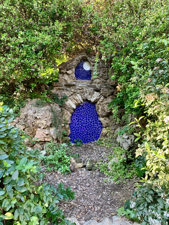 •Las escaleras tienen pedacitos de mosaicos coloridos de diferentes tamaños. The stairs have small pieces of colorful mosaics in different sizes.