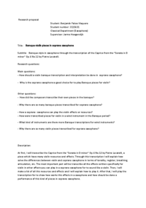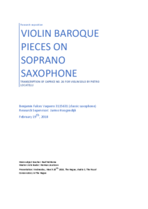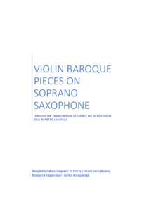 Name: José Benjamín Falces Vaquero Main Subject: Classical Saxophone Research Supervisor: Jarmo Hoogendijk Title of Research: Baroque Violin Pieces on Soprano Saxophone; Transcription of Caprice No. 26 for Violin Solo by Pietro Locatelli Research Question: How should a baroque violin piece be transcribed and played on a soprano saxophone? Summary of Results: There are so many baroque pieces for violin which have been transcribed for soprano saxophone, but there are even more performances of these pieces by almost all classical saxophonists. The reason is that saxophonists often need to improve their repertoire and that these pieces were already frequently transcribed during the period which were made. Also, there have been many saxophonists who have thought that this instrument can give something special to these kinds of works. Based on interviews, questionnaires, comparison of baroque transcriptions and my own experience documented through the whole process of a transcription, this research investigates what is the best way to transcribe and play violin baroque pieces for soprano saxophone. My main conclusion is when writing for these arrangements it is allowed to make many modifications from the original version but always depending on the characteristics of the instrument and the baroque transcription criteria and keeping the original intention of the composer. These results will give the saxophone world more sources of how to transcribe and play these pieces, keeping in mind the original idea of the composer in the baroque style and making it more useful for the instrument. Biography: José Benjamín Falces Vaquero has had lessons with teachers like Vincent David, Ensemble Squillante, Berlage Saxophone Quartet, Arno Bornkamp and others. He won national prizes in Torrent, Xativa and Lliria. He now collaborates with a few Young Orchestras: JOGV, IYPO and ORSAXCOVA. In 2017 he received a Scholarship from the Government of Valencia. As a jazz performer he has had lessons with teachers such as Perico Sambeat, Jerry Bergonzi, Bob Mintzer, Gregory Fritze, and recorded a CD with Big Band Talleres Sedajazz.