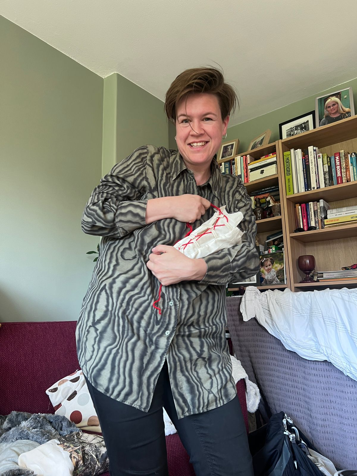 I 2017 begynte jeg aktivt å engasjere meg i frivilligheten på Samisk Hus, engasjerte meg i samisk politikk, etter i 2016 å ha lært at min mor faktisk er samisk. En sår og helende prosess er satt i gang, og mange brikker har falt på plass. En lengsel i meg har stilnet. Jeg lærte meg raskt å praktisere duodji, som er et samlebegrep for det vi kan lage med hendene; klær, gjenstander, dekor, som er historiefortellingen til mine formødre og forfedre. Det er mer enn håndverk. Det ble mye lettere enn jeg hadde trodd, å sy i skinn og jobbe med tinntråd. Hendene mine visste hva de skulle gjøre, og den dag i dag lager jeg, og de leder vei.
