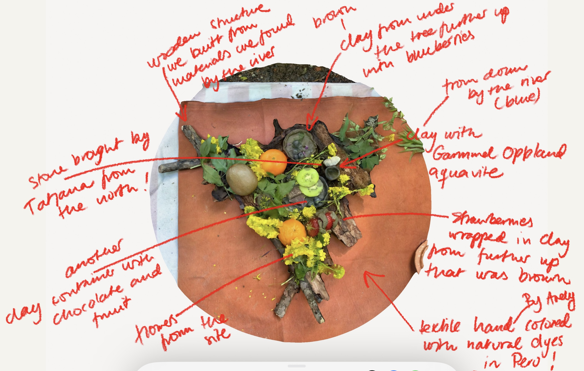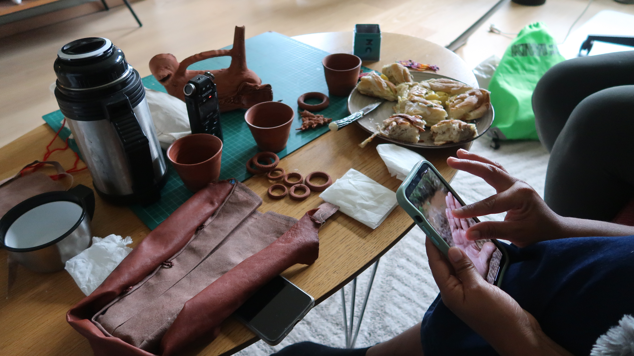 Etter ofringen spiste vi mat og drakk kaffe fra kopper som jeg hadde lagd av blåleire jeg hadde funnet på stedet. Til hver leirevandring har jeg med 16 kopper som jeg har laget med leire fra leirelandskapene. 16 er maks antall som kan være med på en vandring inkludert meg. Koppene kan stables, har kun terra sigillata, ikke noe glasur og er brent til 1100 grader sånn at de nesten sintrer. Tatjana og Arely bestemte seg etter hvert for å sy to poser, til to stabler med 8x8 kopper, som jeg kunne ha med på leirevandringene. Posene er inspirert av den samiske, tradisjonelle kaffeposen og laget med reinsdyrskinn og et tekstil som Arely tok med fra Peru som hun og en kollega farget for hånd med gjørme/leire (mud). Tatjana forteller om duodji:
