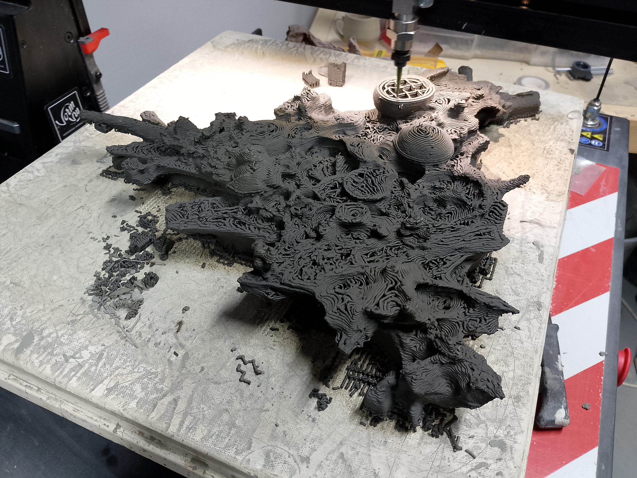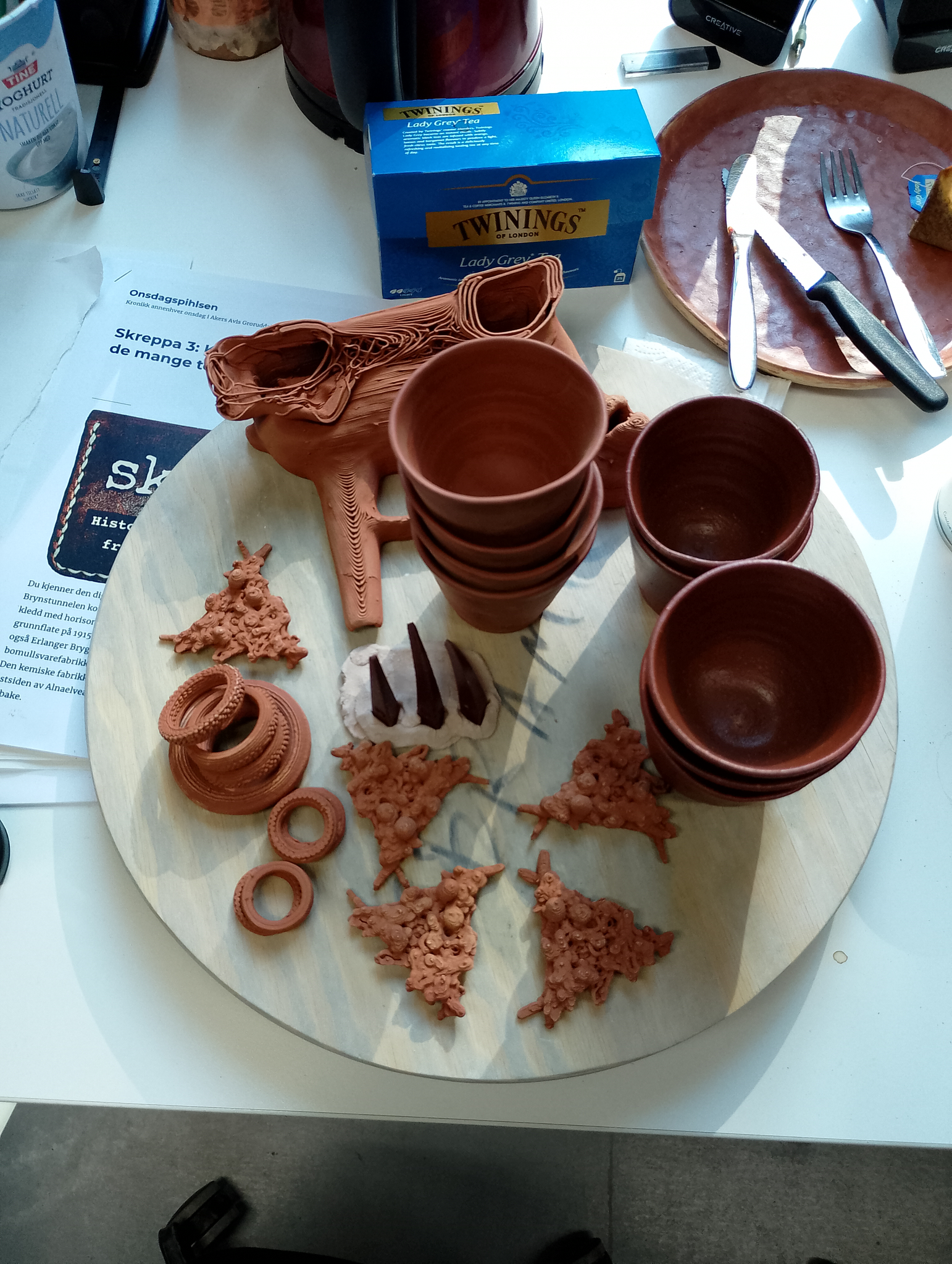 SIGRID Ja, på en måte, for på byggeplassene må de alltid fjerne leire fra grunnen for å kunne lage fundamentet. (...) Og de fjerner den ustabile blåleira som anses som avfall, og dumper det. Leiren som disse koppene ble laget av kom fra en workshop med studenter vi hadde ved Bryn ved elva, hvor vi tok med noen bøtter leire tilbake til KHiO for å jobbe med. Vi brukte ikke alt, så jeg har spart på restene i bøtter i tre år. Jeg visste ikke hva jeg skulle gjøre med den, men nå var tiden inne for å bruke den til koppene. (...) Vi snakket også om økonomi, og disse koppene vil ikke være for salg. (...) De skal brukes i leirelandskapet eller de vil brukes til å snakke om dette landskapet eller disse prosessene som har skjedd der.