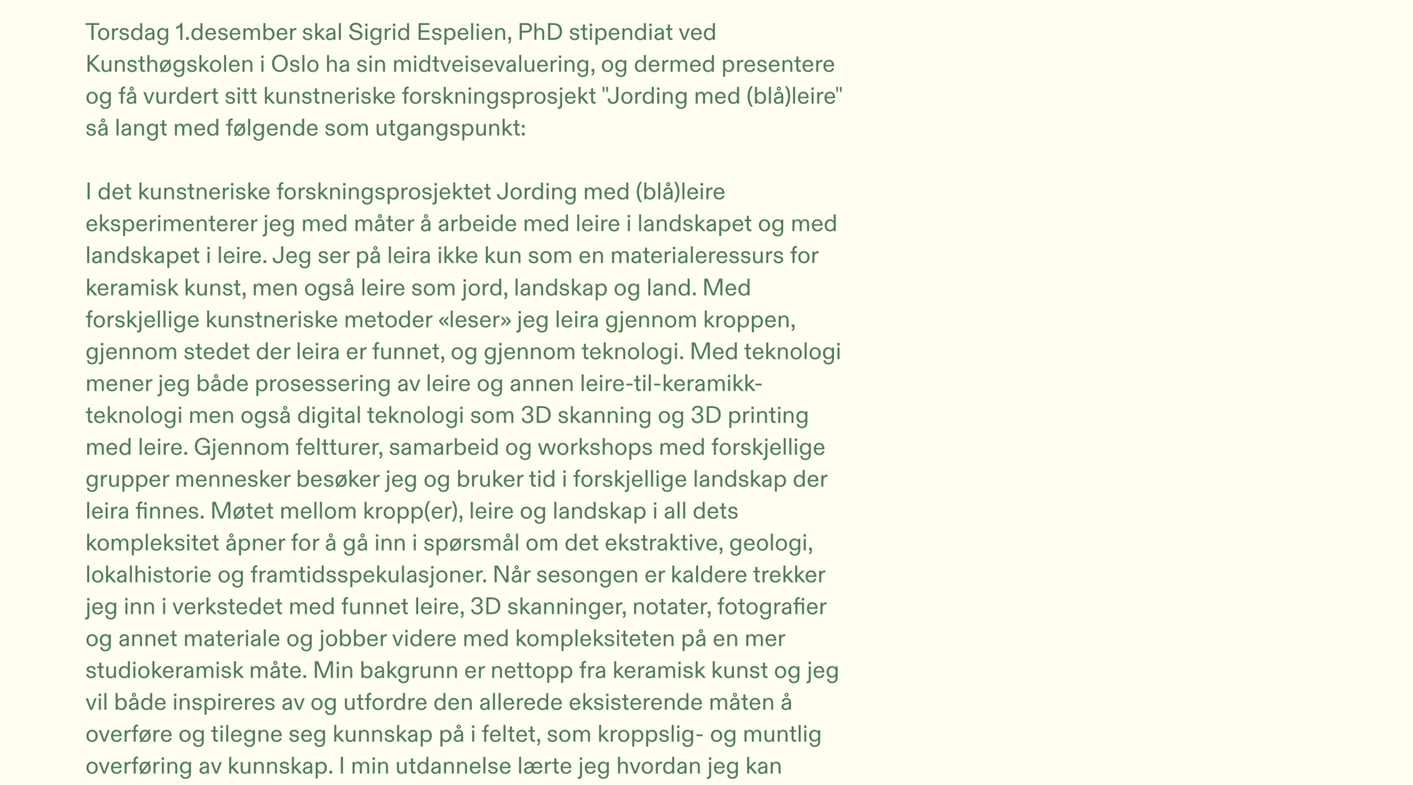 A Jeg vil reflektere over rollen til keramikkobjektet i dette prosjektet, og slik jeg ser det, er det et svært rikt og komplekst prosjekt som tillater ulike metoder på stedene du utforsker. Du har leire, teknologi, det samarbeidsbaserte verkstedformatet, det stedspesifikke og arkeologi, og jeg ser på disse som områder for utforskning. Dette er dine tenkeverktøy, dette er der du er engasjert og der ting skjer. Dette er områder hvor forskningen foregår, mens jeg ser keramikkobjektet mer som et vitnesbyrd om en prosess som har funnet sted eller dokumenterer disse prosessene. Jeg ser egentlig ikke keramikkobjektet i seg selv som en utforskning med integritet. Vil du svare på det?