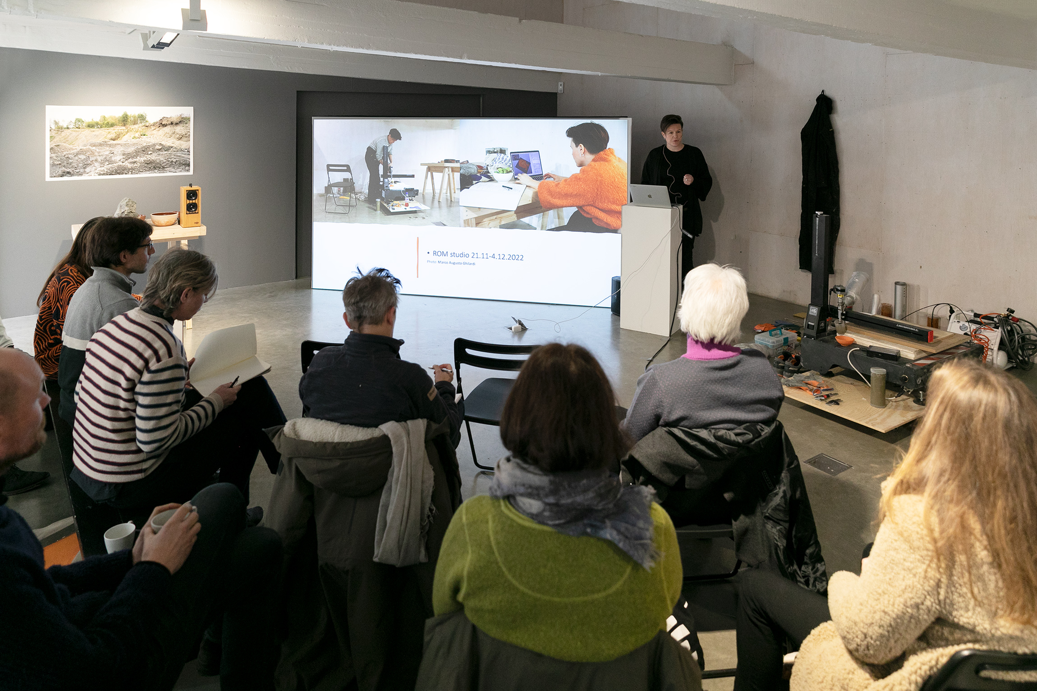 C For å legge til, hva gir du til feltet? Vi brenner ting, men trenger du egentlig dette? Fordi det er her din tilknytning ligger, det er her det skjer (peker på bildet av Feiring bruk), men tilbake til spørsmålet – er de objekter, er de skulpturer? Det er et annet forskningsprosjekt på en måte. Det vil bli det neste. Hva skal man gjøre med arkivet eller dokumentasjonen? Så kanskje du virkelig trenger dem på en måte. Bruk denne tiden til å tenke utenfor boksen om dette. Og kanskje objektene overlever, men da vet du hvorfor. Du vil kanskje få et nytt forhold til objektene dine.