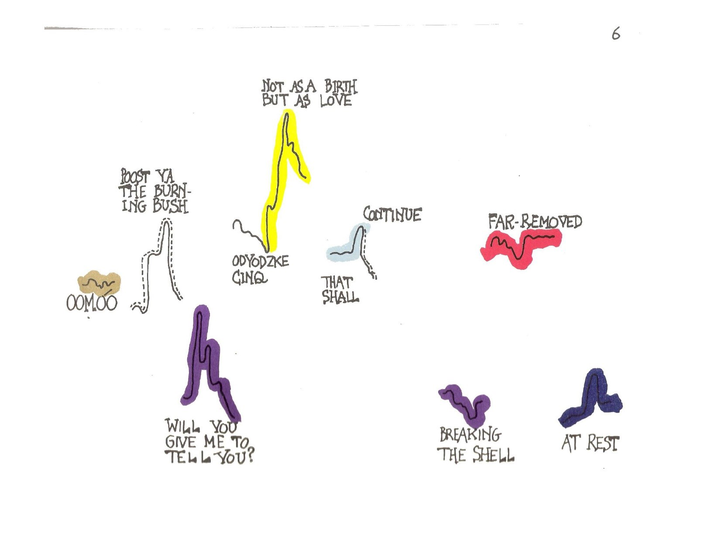 In the Aria, the task of the performer is quite different. The performer should choose 10 styles of singing in advance and connect these freely to the different colors and line styles drawn in the score. Explained is that the horizontal direction represents time, the vertical, pitch, as usual; on which scale is not explained. There are black squares added that indicate noises that may be produced with the voice in an unmusical way or with percussion instruments. Determined are: rough indication of relative duration, rough indication of pitch, amount of distinctive singing styles and noises, text. Undetermined are: tempo, pitch range, dynamics, instrumentation of the noise-sounds.