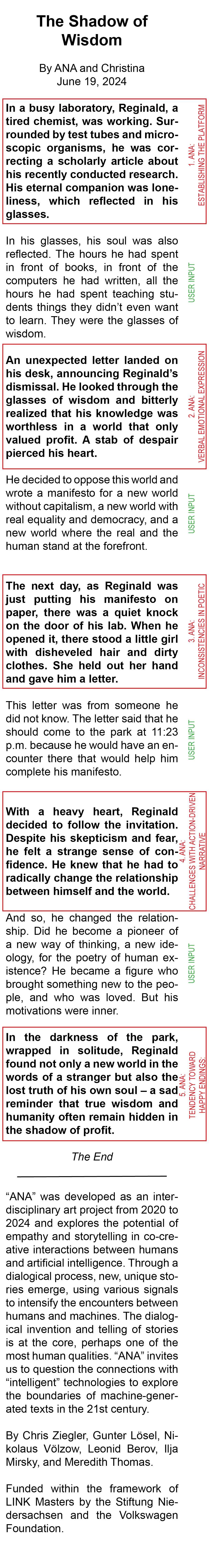 To provide a better understanding of the experience, we find it indispensable to present readers with an example story. In the following section, we will first provide a story that was actually created during a session with ANA. Since the language of that interaction was German, we will also provide a machine translation into English. Then we will discuss the narrative structure of the story and how it emerges from the employed prompt design. After that, we analyze the story in terms of the dramaturgical approaches of improvisational theater and discuss the implications for both prompt design and human-computer co-creativity.