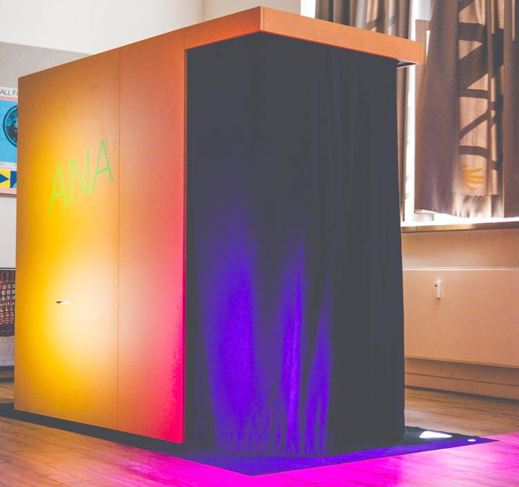 ANA is a walk-in installation in the form of a photo booth that offers a ~10min interactive experience. Upon entering the booth and sitting down, there is a short, scripted introduction in which the system introduces itself and the user gets acquainted with the interaction dynamics of the experience. After that, the system starts to improvise a fictional story based on three topics the user suggests. The user and ANA both continue the story, taking turns, with ANA holding responsibility to maintain a well-formed narrative structure and ensure a dramatically interesting development of the plot (see Section 4 for an in-depth analysis of such a story). After a number of turns, the system wraps the story up with a suitable ending. It reflects with the user about the story and its creation process during a short debrief (see Section 3 for a discussion of the implications of this metacommunication). Upon leaving the booth, the system presents a printout of the unique story that was created during the experience to the user as a gift. All interactions with ANA take place via spoken—not typed— language, and also ANA’s output is presented using text-to-speech technology. Additionally, a Pepper’s Ghost illusion is used to display the improvised story in the form of seemingly free- floating text, scrolling past the user.