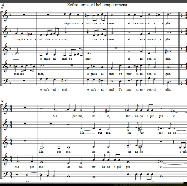 1.Zeffiro torna e i’l bel tempo rimena E i fiori e l’erba, sua dolce famiglia, A garrir Progne a pianger Filomena E Primavera candida e vermiglia. Ridono i prati e ‘l ciel si rasserena; Giove s’allegra di mirar sua figlia; L’aria e l’aqua e la terra e d’amor piena Ogni animal d’amar si riconsiglia.