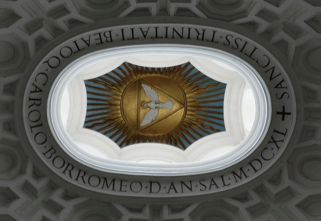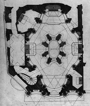 An example of Borromini's exceptional inventive capacity and synthesis of traditional and new, is the ground plan level of San Carlo alle Quattro Fontane. One interpretation of the geometry of the plan is made by Leo Steinberg, based in drawings from Borromini made after the construction of the church: a geometric construction related to the symbol of the trinitarian’s order,Tre et uno asieme, (three and one together), represented by a triangle circumscribed in a circle, a motif which is repeated throughout all levels of the interior, from the ground plan to the lantern and exterior façade.