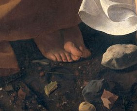 The most important change in relation to earlier representations of the theme, is introduced by the prominent place of the angel in the centre of the composition instead of the conventional background position. With his back turned, totally absorbed in his playing, the Angel divides the painting in two contrasting parts. The first, occupied by the figure of Joseph with shadowed face and bare feet placed on a stony and infertile ground, is set in a dark background. The contrast with the illuminated figures of the Angel, the Virgin and the child, makes even more visible the apparent rudeness of Joseph and the graceful figure of the angel, with white drapery spirals around his limbs. On the other side, the delicate representation of mother and child, surrounded by lush vegetation, is circumscribed in a closed circle, feature that Caravaggio had already used in the painting Maddalena Penitente, with the same female model.