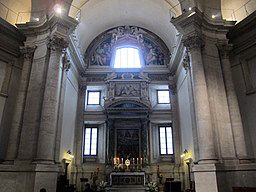 Another possible interpretation, defended among others by Paolo Portoghesi, points out the fusion of two contrasting spatial forms and the juxtaposition of two opposite axes; one longitudinal, derived from a classical oval shape (molle/ figure of Maria in Caravaggio) and one transversal which can be related to the Greek cruciform shape (durus/ figure of Joseph).