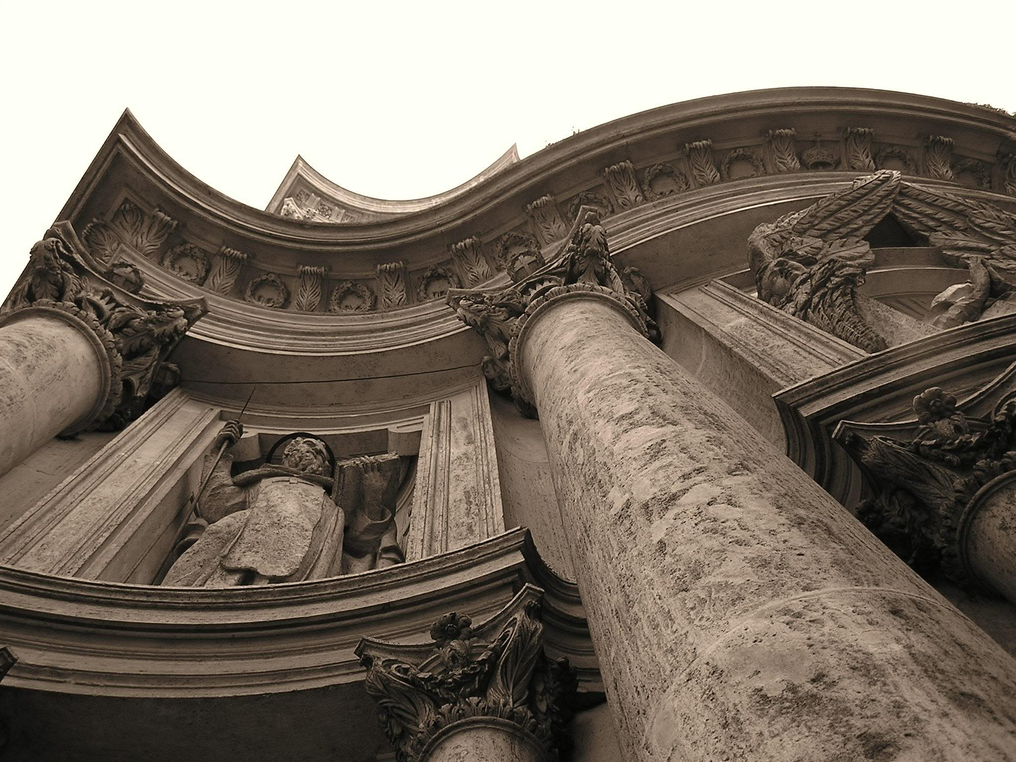 The division in two main horizontal sections, has a direct correspondence with the first order of the columns in the interior, the undulated cornice on top of the first order announced in full expressive force in the exterior. This horizontal element which could remind us of the nymph’s vocal line in its freedom of form, accompanies in his undulation the shape of the wall. This movement is mostly generated by the juxtaposition of two concave lateral sections and the central convex section of the main entrance, which replicates the sweeling of the space inside. A movement that is accentuated by the verticality of the monumental Corinthian columns which have their continuation in the superior section. This upward impulse seems to converge towards the central medalion with the statue of San Carlo Borromeo, to whom the church is dedicated.