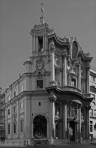 In Borromini’s façade for the church of San Carlino, this contrast and the use of the curve for expressive and structural reasons, materializes in many aspects of its formal construction. The two sides corresponding to the two adjacent streets, which limits the whole convent of the Trinitarian order, present a classical structure with prominent sober lines; the "homo-rhythmic" structure of the vertical elements on one side and the decorative elements based on the trinitarian theme of the interior, “tre in uno”, on the other side (first and third section of the lamento, cantato al segno della mano).
