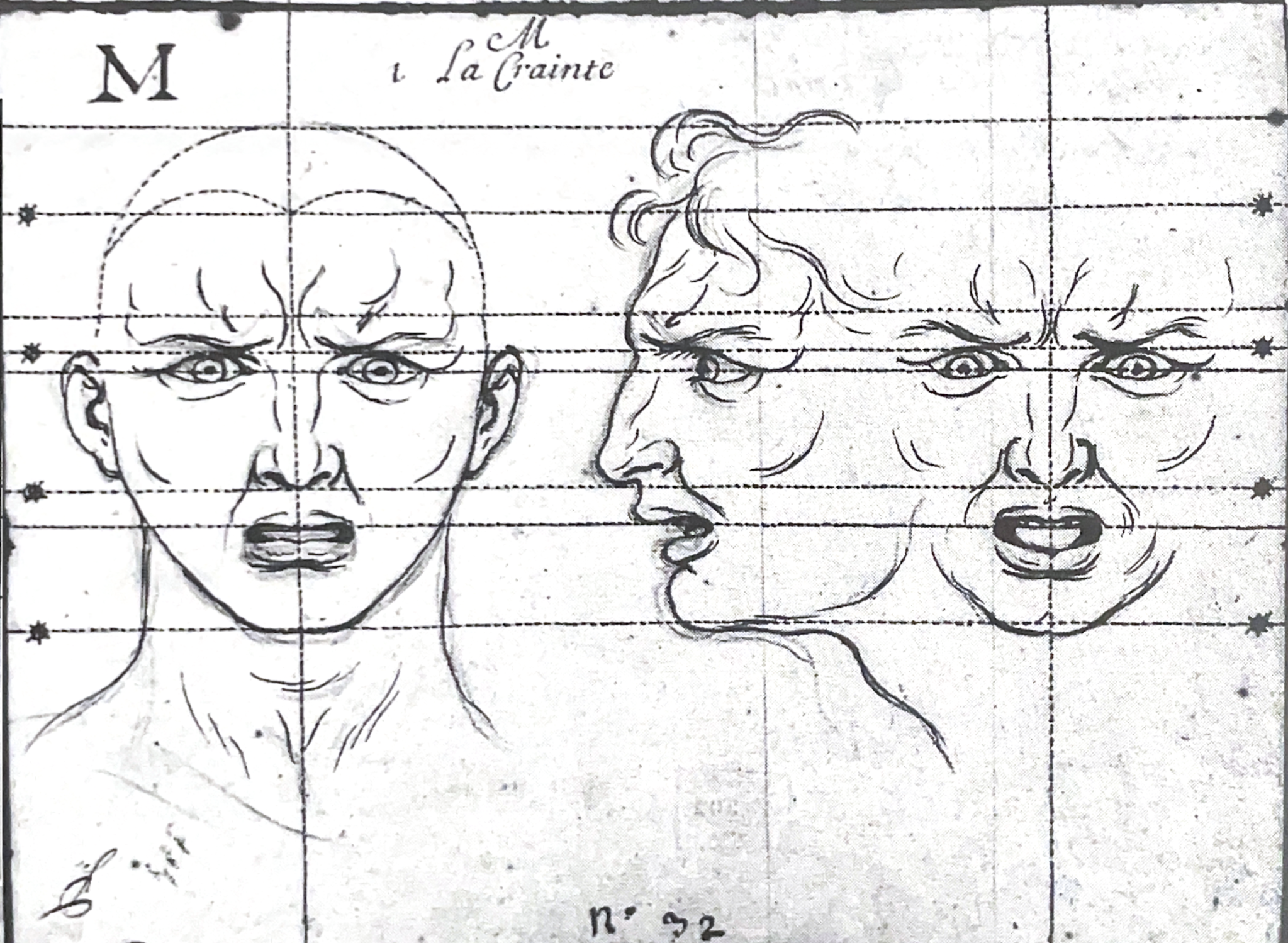 "(...) The movements of Fear are expressed by the inner end of the eyebrow slightly raised; the pupil is bright, in restless movement, and situated in the middle of the eye; the mouth is open, drawn back, and the sides more open than the centre, and the under lip drawn further back than the upper. The complexion is redder than in Love or Desire, but not so beautiful, for it has a somewhat livid tint; the lips are of this same colour, and also dryer than in Love. (...)"3