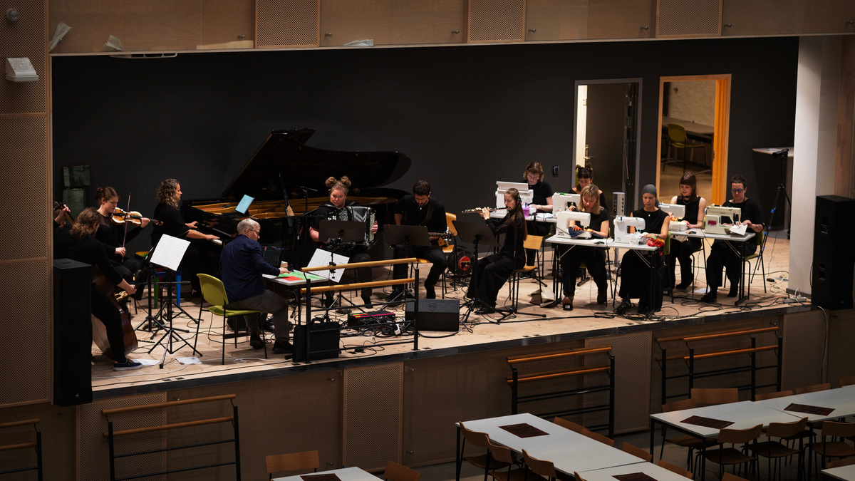 The work consists of sounds from the textile industry: both an imagined soundscape of a factory environment, real samples of industrial sounds and live sound from an orchestra of sewing machines.