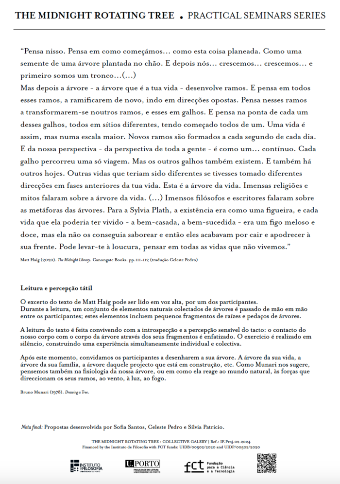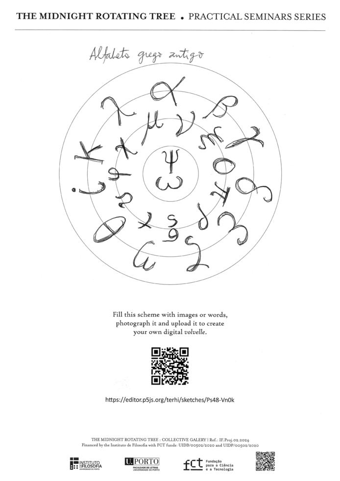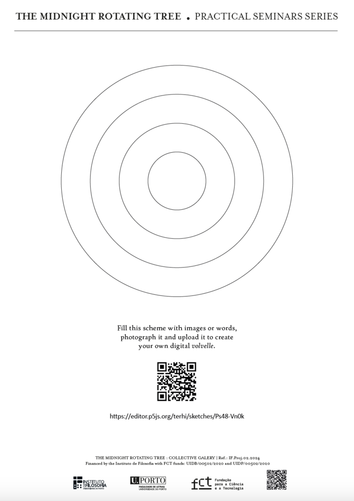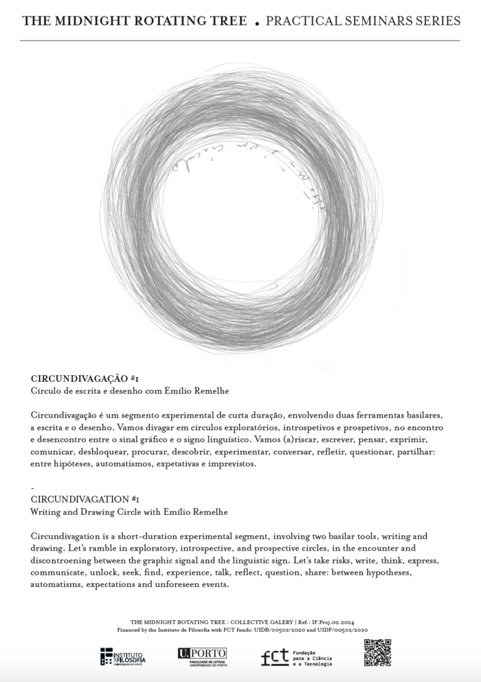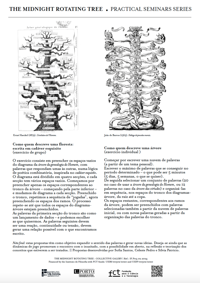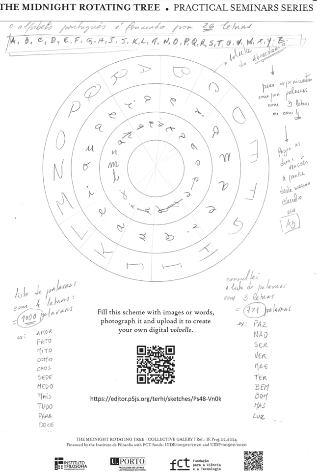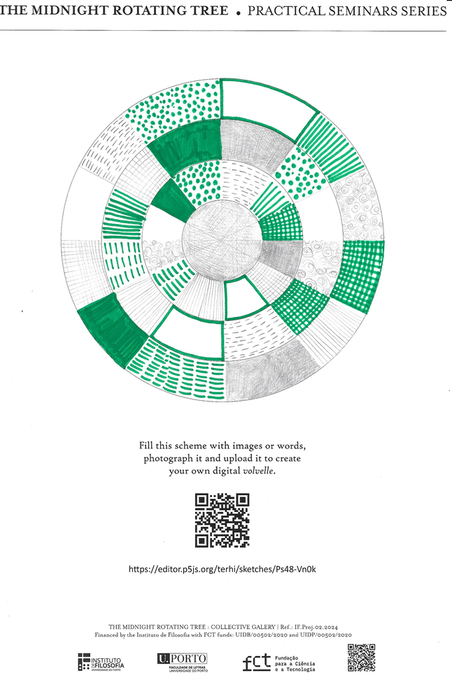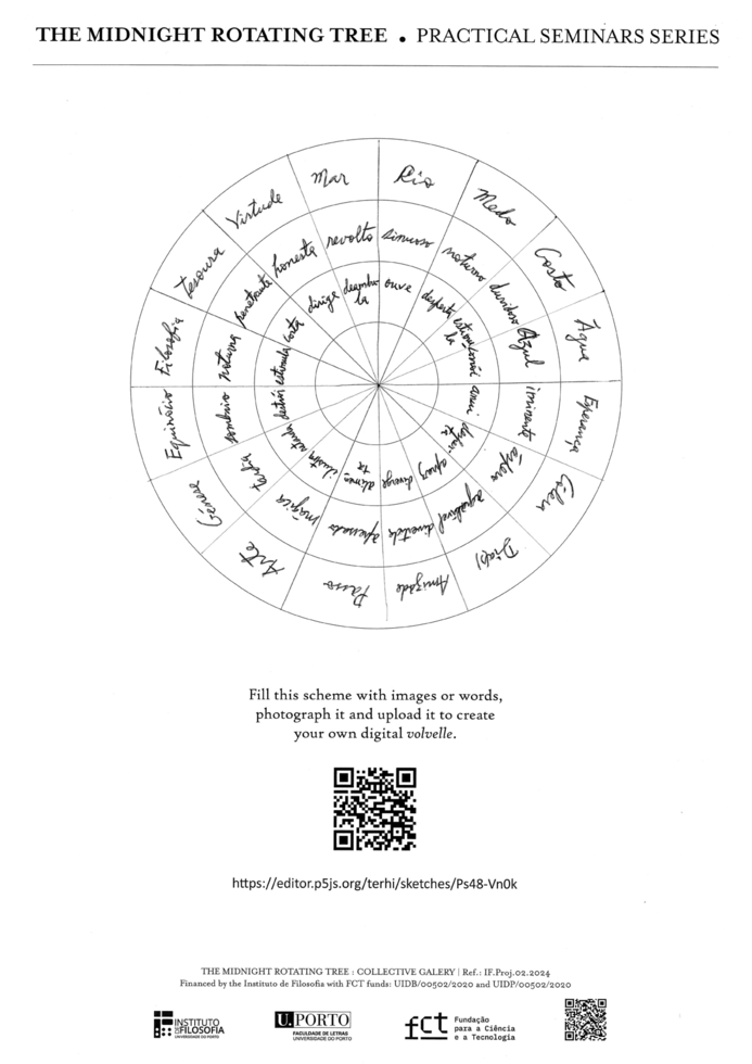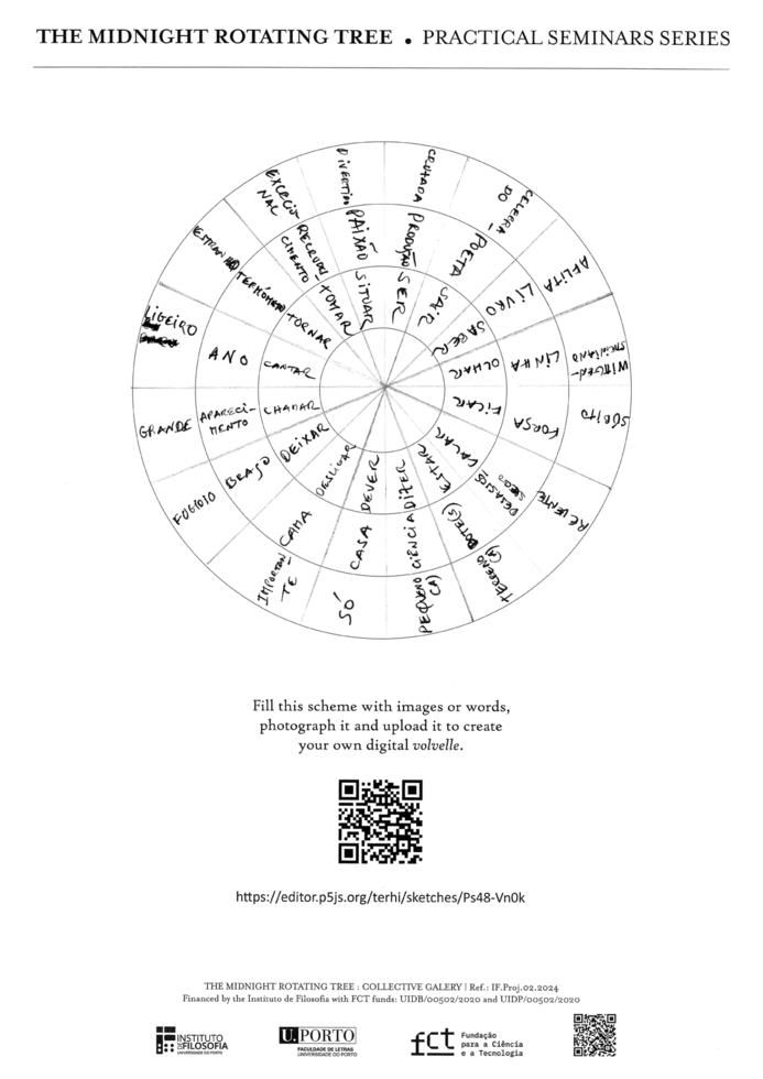 Os workshops aconteceram em duas partes: "Árvores" em julho, e "Círculos" em setembro de 2024. E nestes, orientei as propostas intituladas "Como quem descreve uma árvore" e "Volvelle - ou o diagrama em movimento como forma de ensaio", respetivamente.