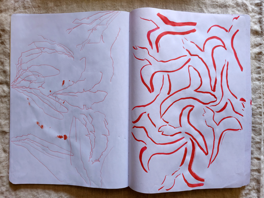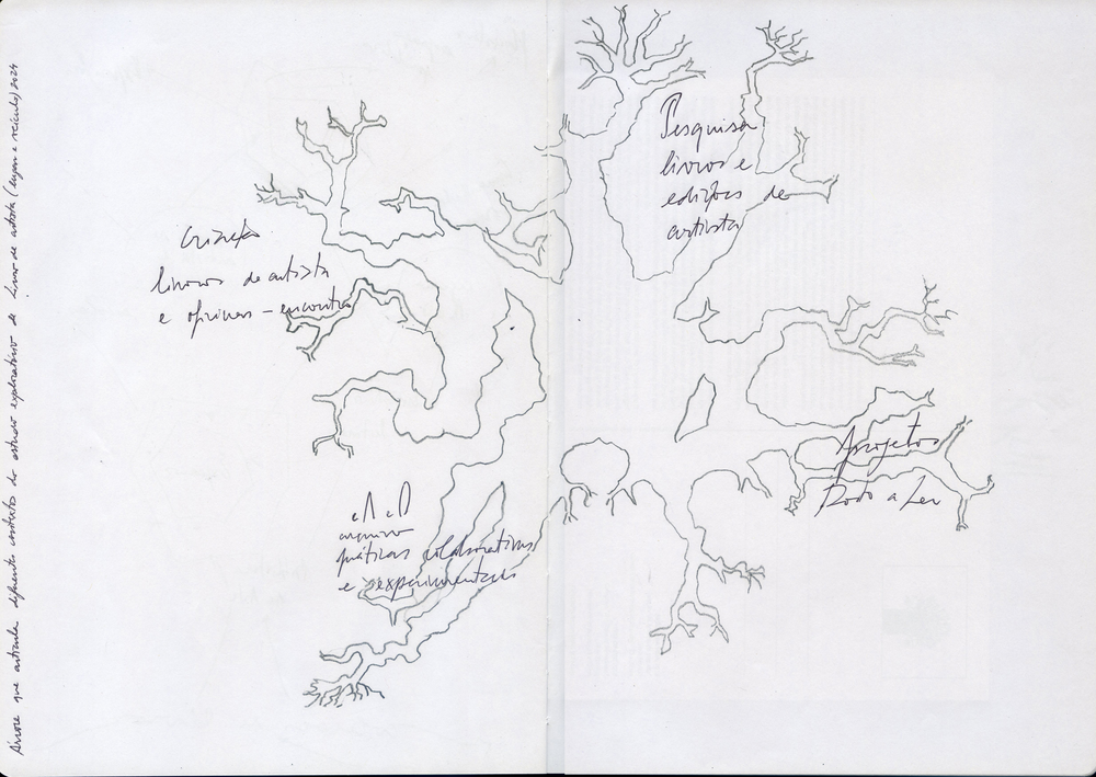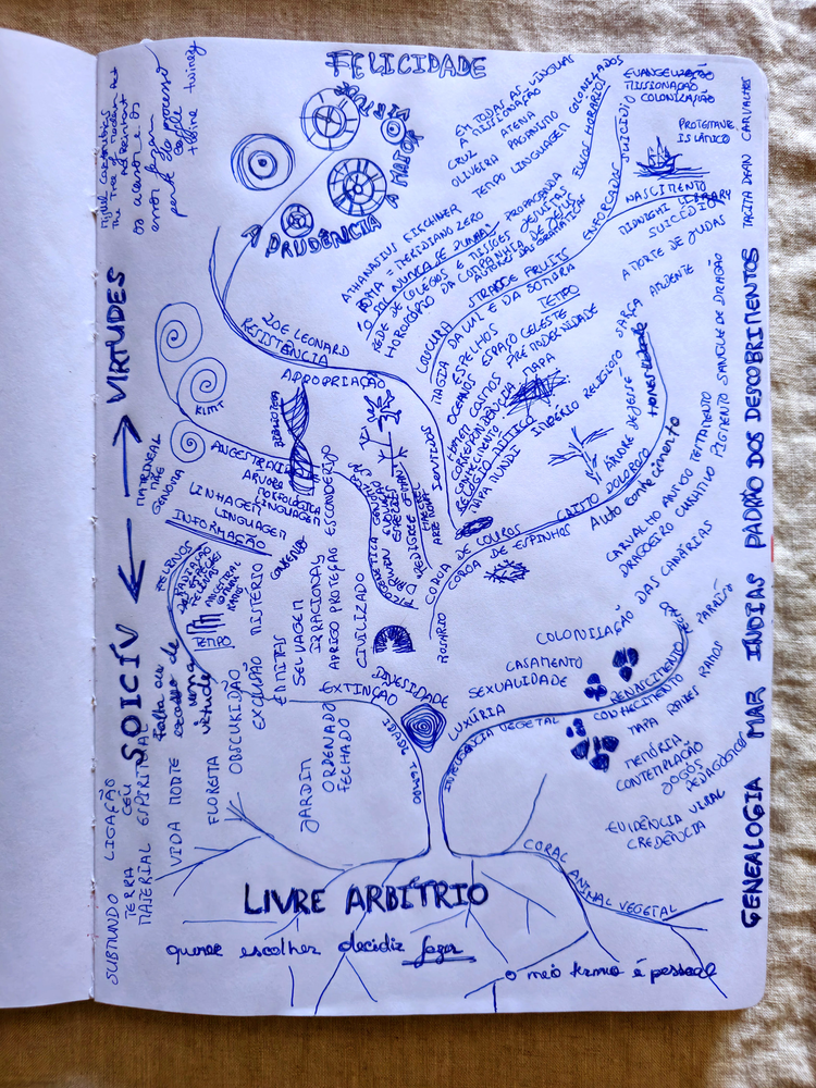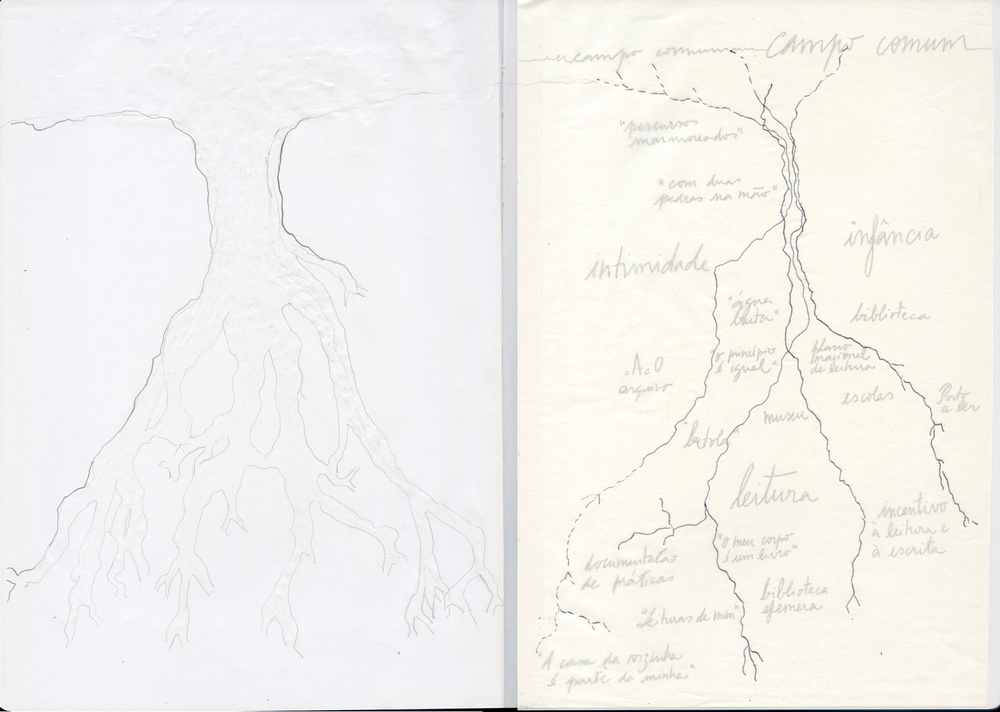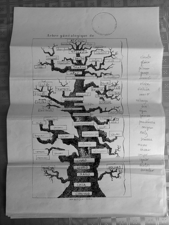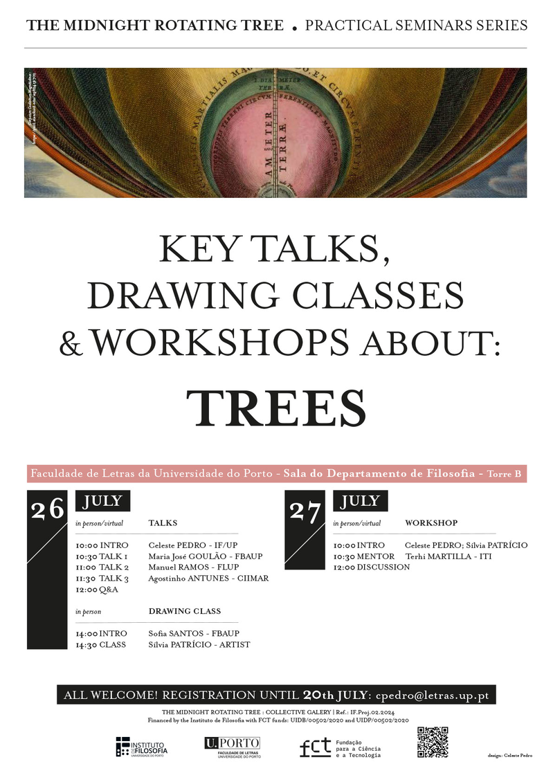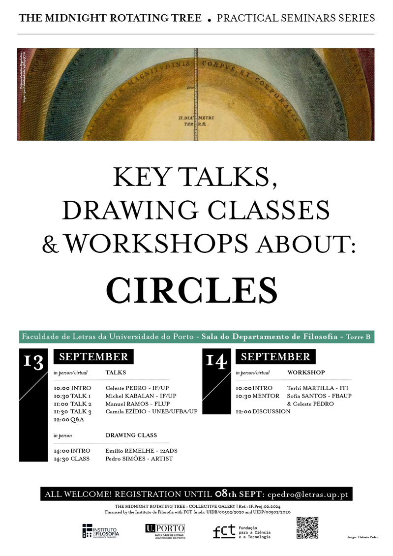 Os workshops aconteceram em duas partes: "Árvores" em julho, e "Círculos" em setembro de 2024. E nestes, orientei as propostas intituladas "Como quem descreve uma árvore" e "Volvelle - ou o diagrama em movimento como forma de ensaio", respetivamente.