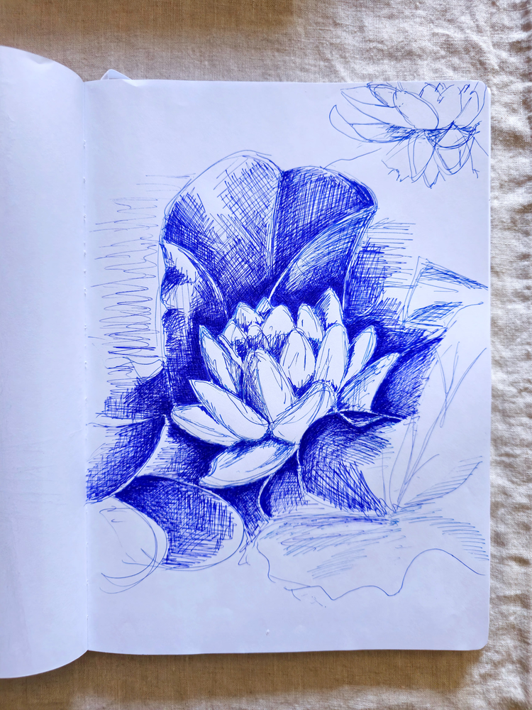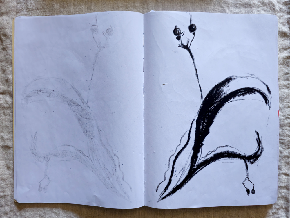 Depois foi a folha de agapanto. agápe e ánthos, flor do amor. Lírio-do-Nilo. África, mãe. Negro de fumo. Tinta da China. Vasos condutores paralelos onde a spina assenta. Transposição. Impressão.