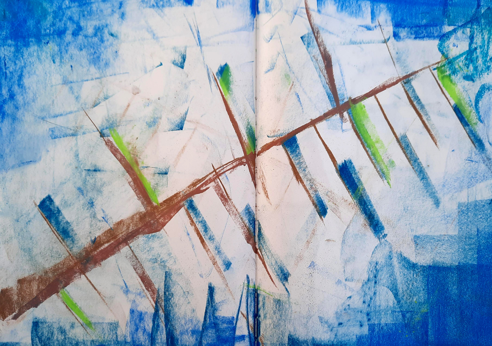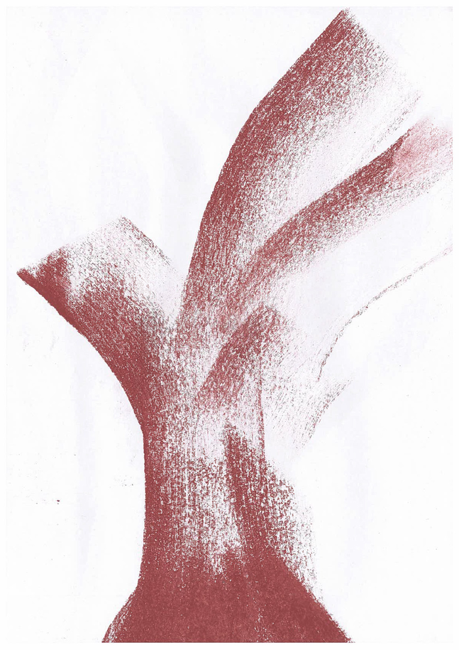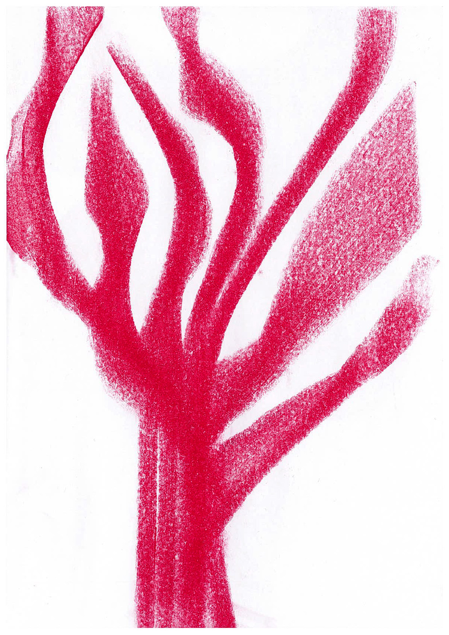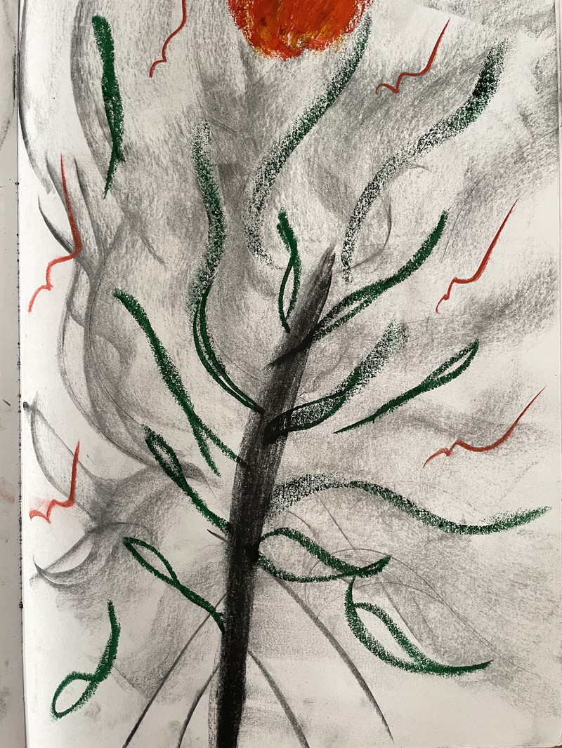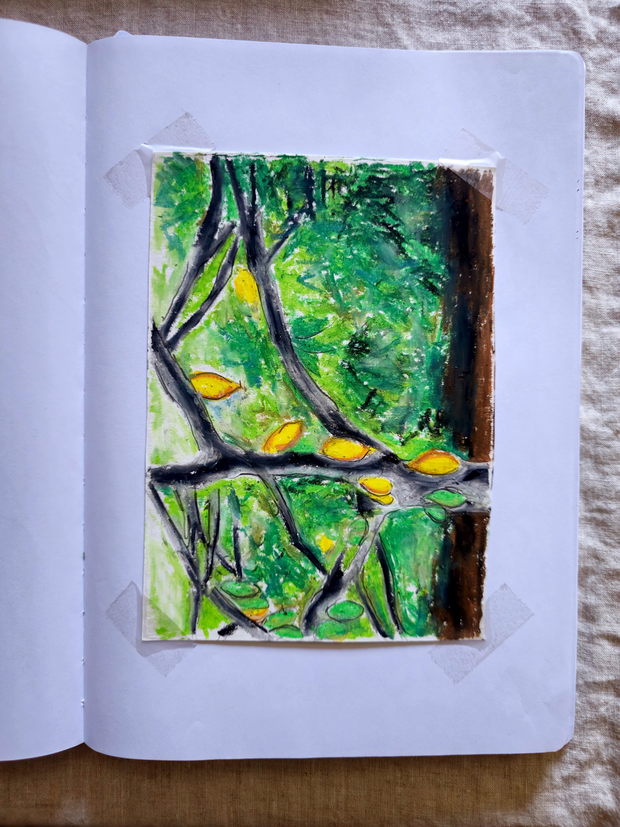 A partir daqui a liberdade de movimentos tomou conta da minha mão, desenhando árvores com pastel seco numa dança não premeditada e sem um fim em si mesma.