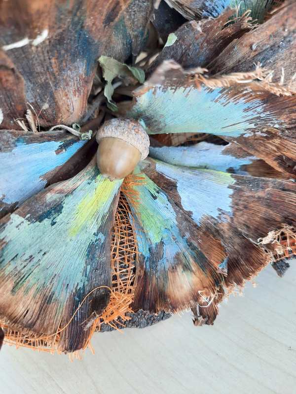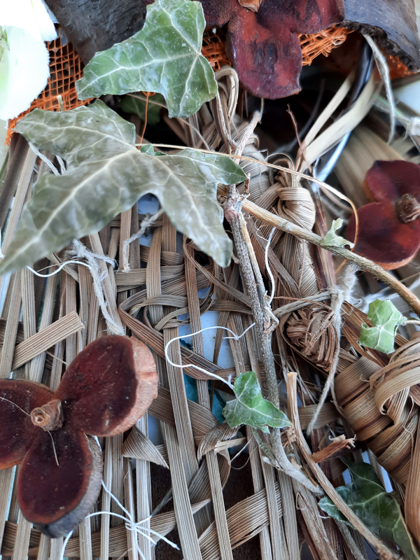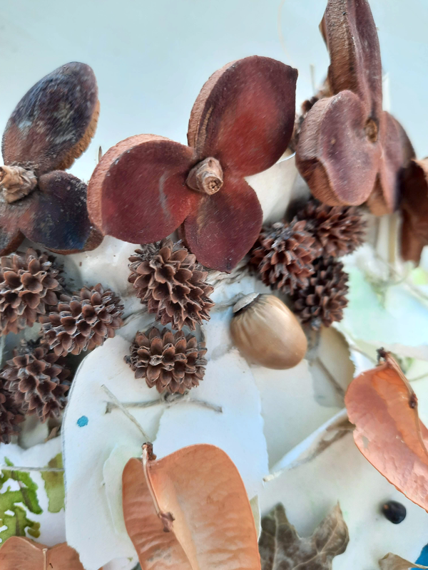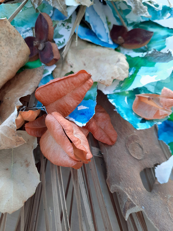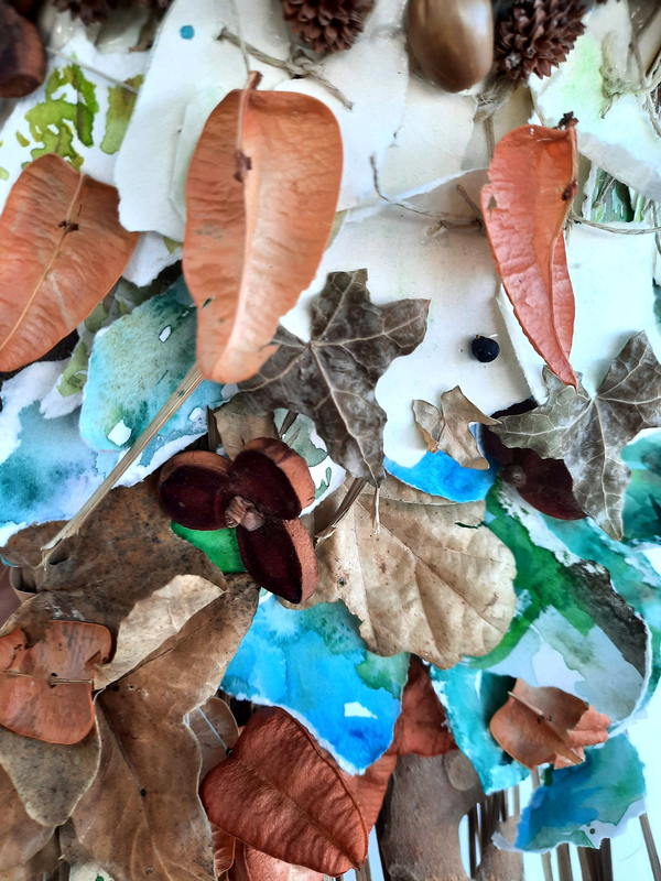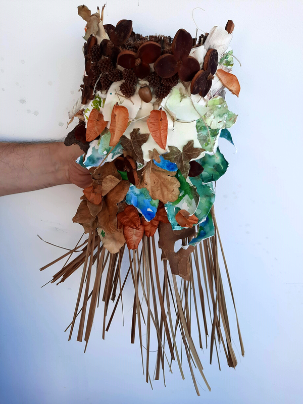 As folhas das árvores são simbolicamente representadas por pedaços de papeis desenhados ou manchados com diversos meios abrasivos e líquidos (exercícios realizados no seminário), por folhas secas, por cascas, por flores secas, todas elas presas a um entrançado que forma um coberto e que culmina superiormente num bouquet em cujo centro contém uma bolota.