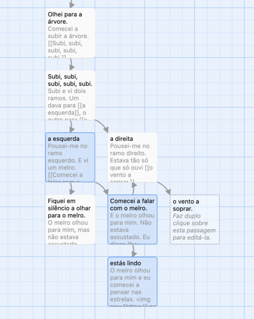Description: My contribution was to share a digital approach to working with trees. As an artist-researcer working with text, writingh and voice, I chose to do a small walkthrough of Twine, a tool for "writing in trees". The small multilinear story we wrote together follows the trajectory of the reader as they climb a tree and make the aqcuaintance of a blackbird (melro). Click the link on the left to explore the story.