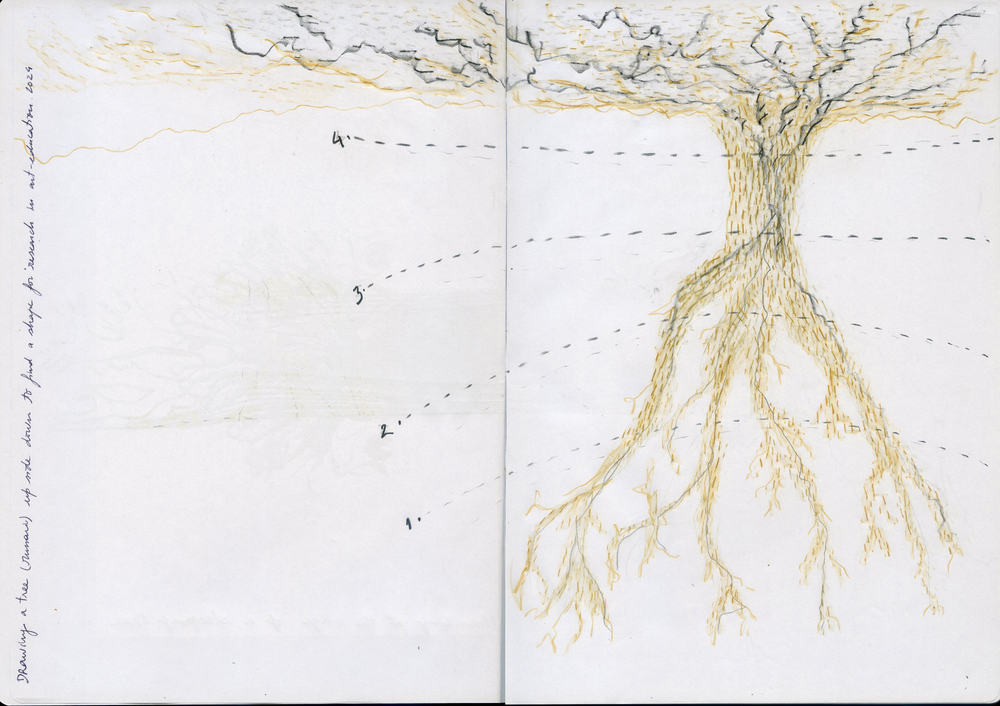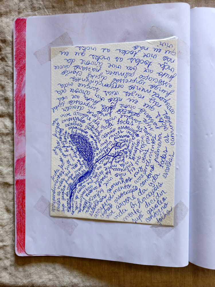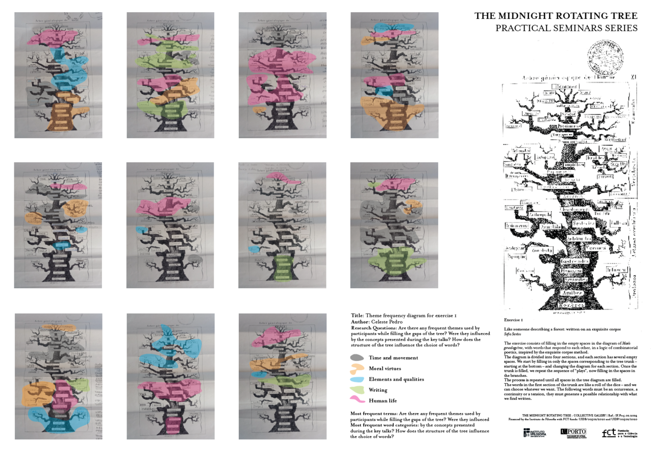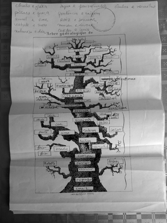 Em "como quem descreve uma árvore" – proposta desenvolvida para o workshop “Trees” – abordei a utilização de diagramas em árvore para organizar e visualizar ideias, a partir do campo de investigação em arte-educação. A árvore, como metáfora e estrutura, permite representar percursos de pensamento, destacando a relação simbólica entre corpo humano e árvore. Fiz uso de referências ao trabalho de Alberto Carneiro, que explora profundamente essa relação. Os participantes foram convidados a preencher diagramas em árvore, utilizando técnicas como o cadáver-exquis para criar uma poética combinatória. A proposta promoveu uma reflexão coletiva e introspetiva, e criou as condições para a manifestação e valorização de novas conexões e significados.